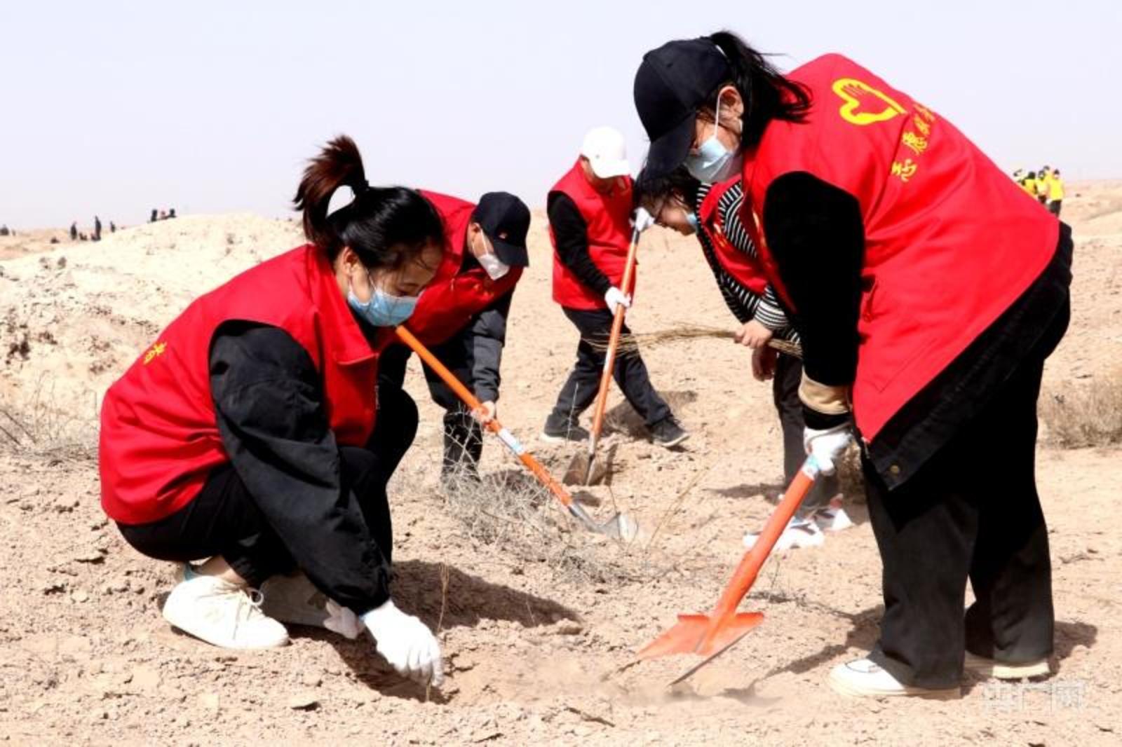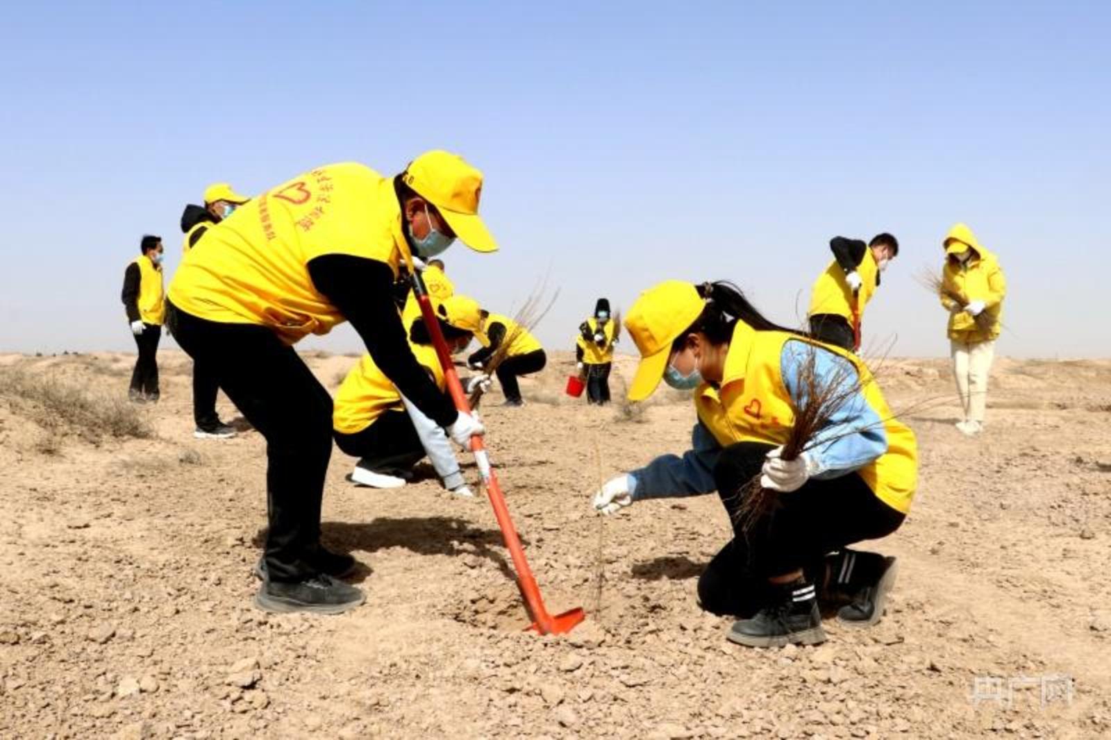 民勤县昌宁镇四方墩生态林基地义务植树现场(央广网发 王杰己 摄)