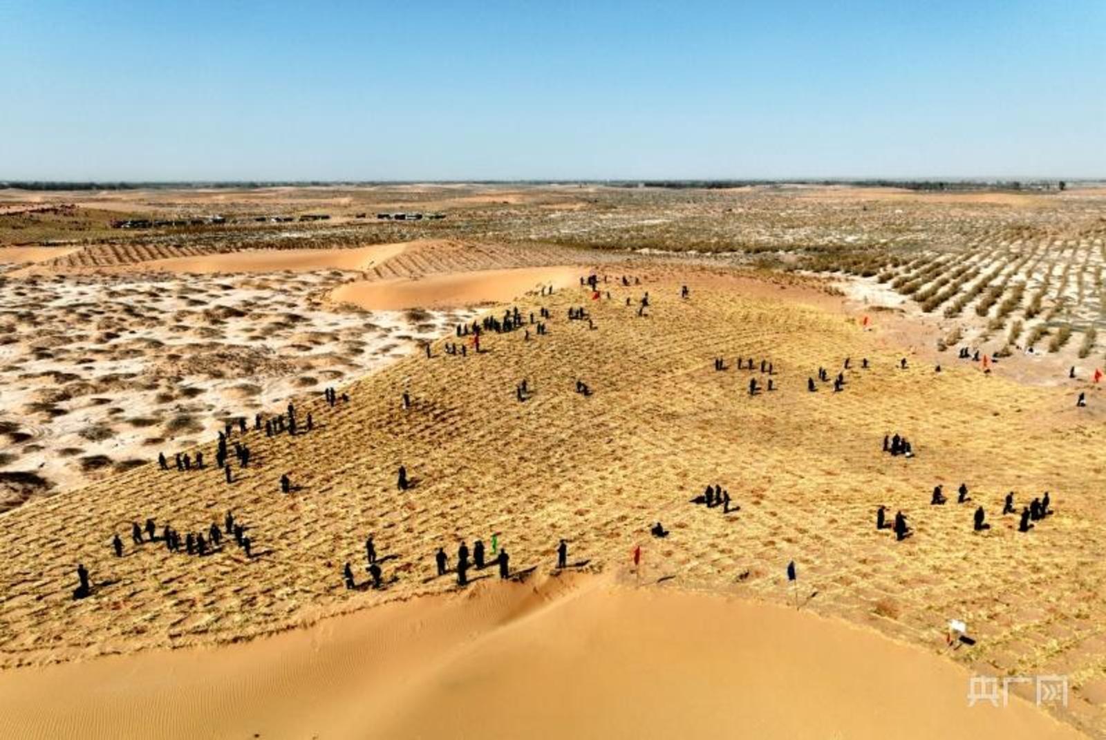 央广网兰州4月1日消息(记者李红军 通讯员马爱彬)3月31日,甘肃省武威市组织市县机关单位干部职工及志愿者3800多人,在民勤县昌宁镇四方墩生态林基地集中开展义务植树活动,他们或两人一组,或三五搭档,挥锹铲土、挖坑栽苗、植树造林,为生态文明建设再播绿色希望。一番忙碌后,梭梭、柽柳等苗木迎风展叶,“驻守”沙漠,同金黄色的稻草沙障一道,牢牢缚住座座沙梁。