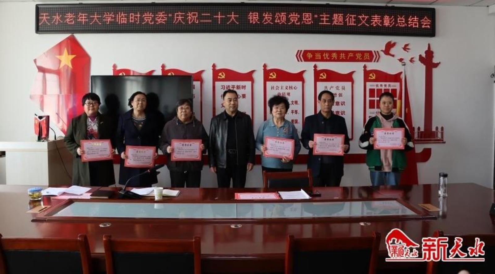 近年来,天水老年大学诗词班的作品在地(市)级以上媒体平台发表作品600余首,创作人员约100人/次;在地(市)级以上报刊杂志发表作品300余首,创作人员约70人/次。