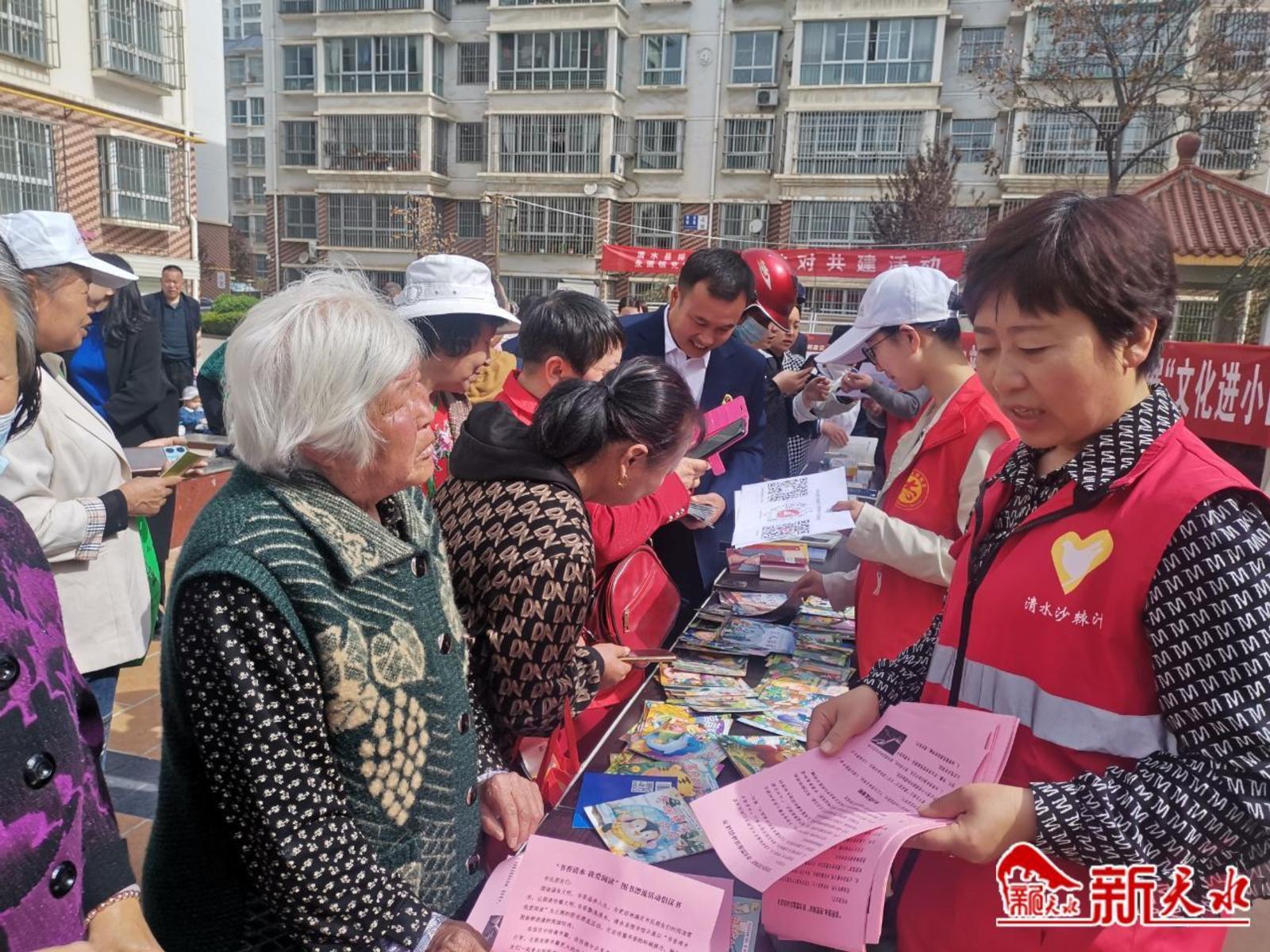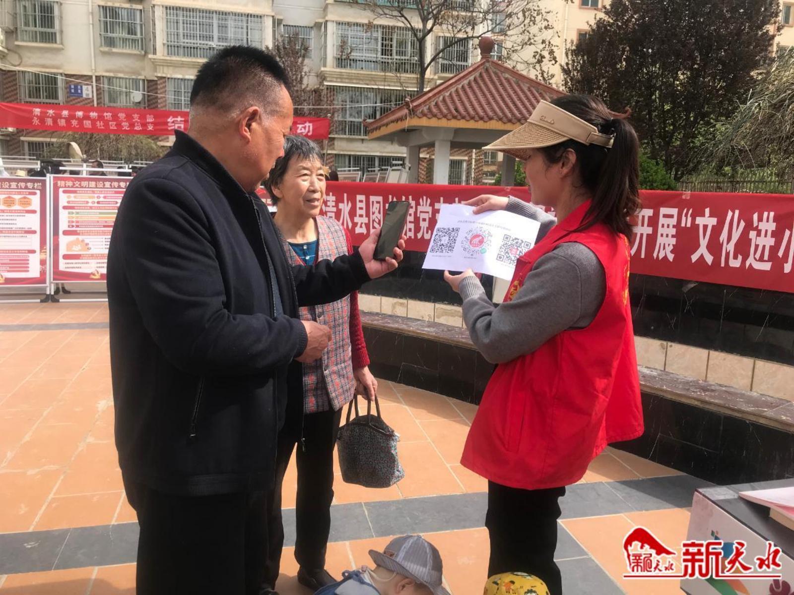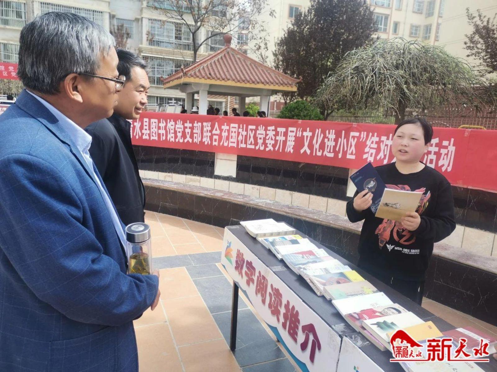 新本水讯【记者刘蕾】草长莺飞四月天,正是读书好时间。在第二十八个世界读书日即将来临之际,4月18日,清水县图书馆党支部联合永清镇充国社区党总支开展了“文化进小区”活动。