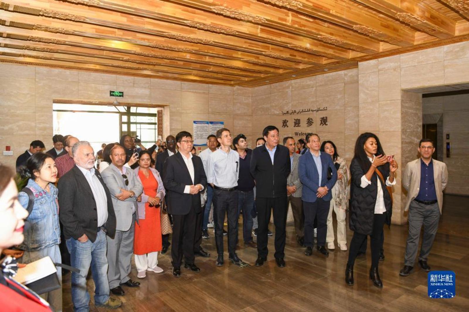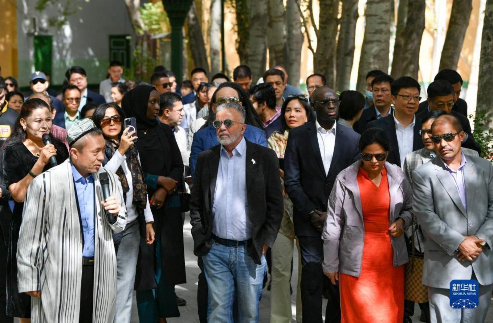 巴西、伊朗、印度尼西亚、巴基斯坦、厄瓜多尔和塞内加尔等14国驻华总领事参观新疆喀什市老城区保护综合治理纪念馆(4月24日摄)。新华社记者 胡虎虎 摄