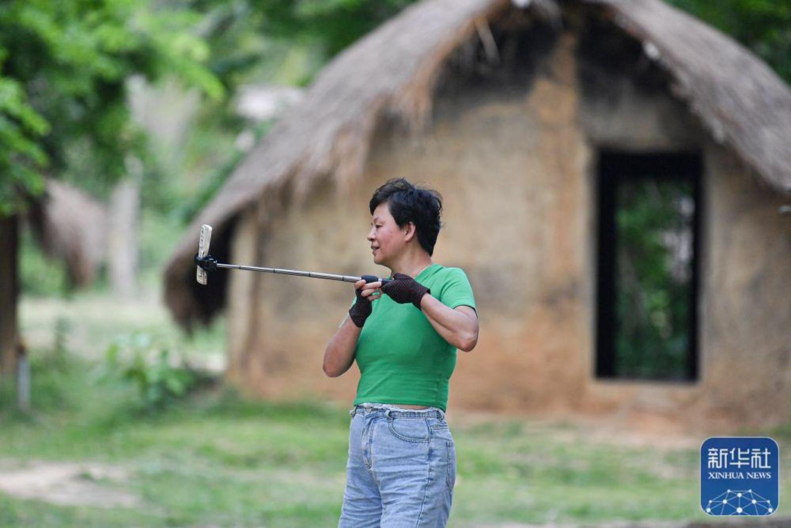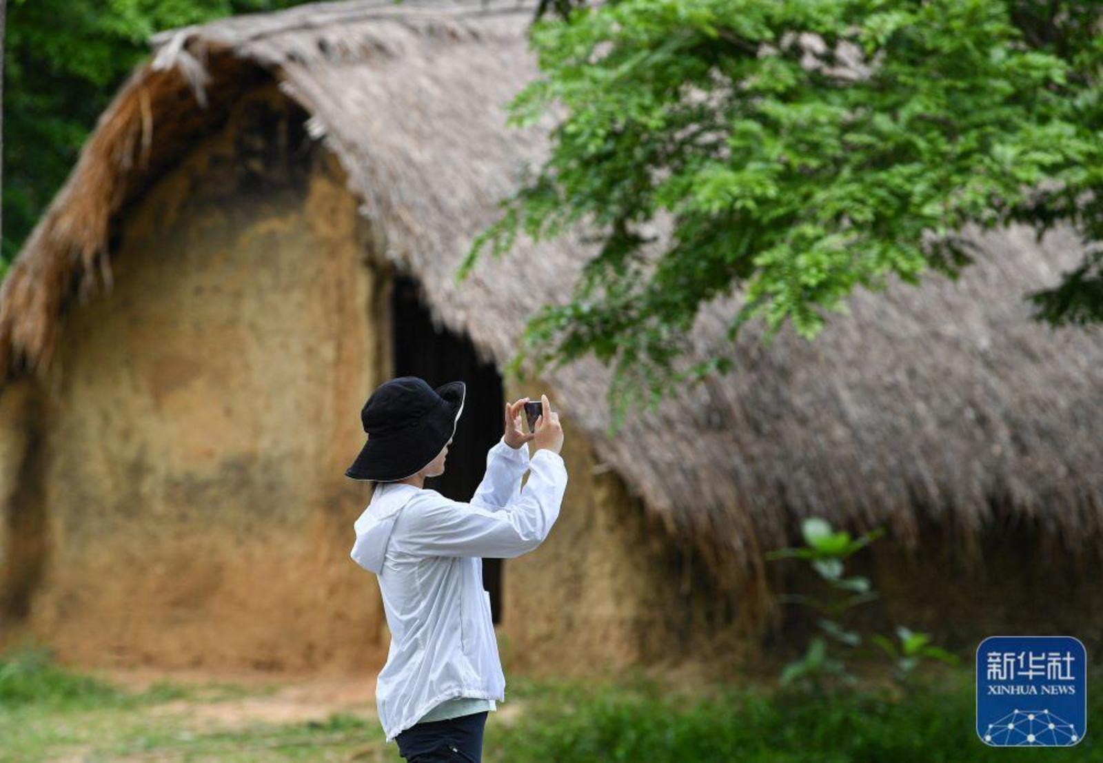 ↑4月28日,游客在海南省东方市白查村参观、拍摄黎族船型屋。