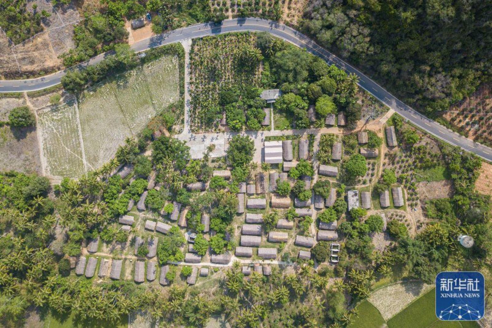↑4月28日在海南省东方市白查村拍摄的黎族船型屋及近年修建的道路(无人机照片)。