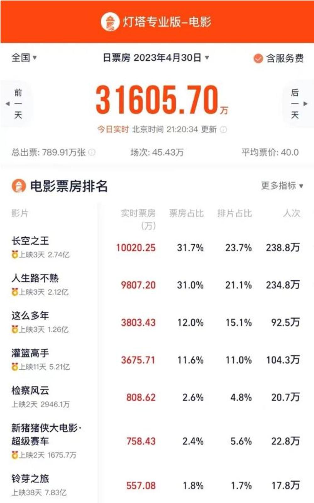 据灯塔专业版实时数据,截至4月30日21时20分,“五一档”次日(4月30日)大盘票房突破3.16亿元,超过“五一档”首日票房3.14亿元,其中《长空之王》《人生路不熟》《灌篮高手》《铃芽之旅》等多部影片单日票房均创新高。