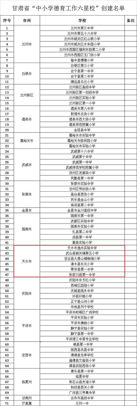 根据《甘肃省“中小学德育工作星级校”创建实施方案》要求,在各地各校申报、专家评审的基础上,经省教育厅研究,拟确定兰州市第三中学等71所学校为甘肃省“中小学德育工作六星校”。现予以公示,接受广大群众监督。