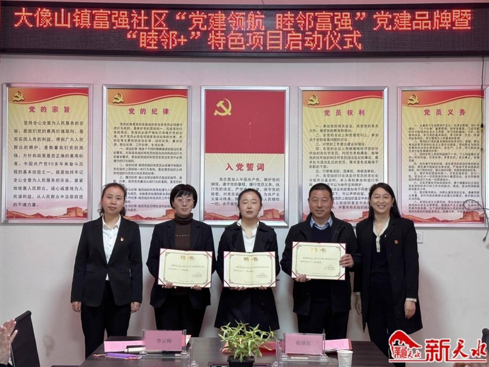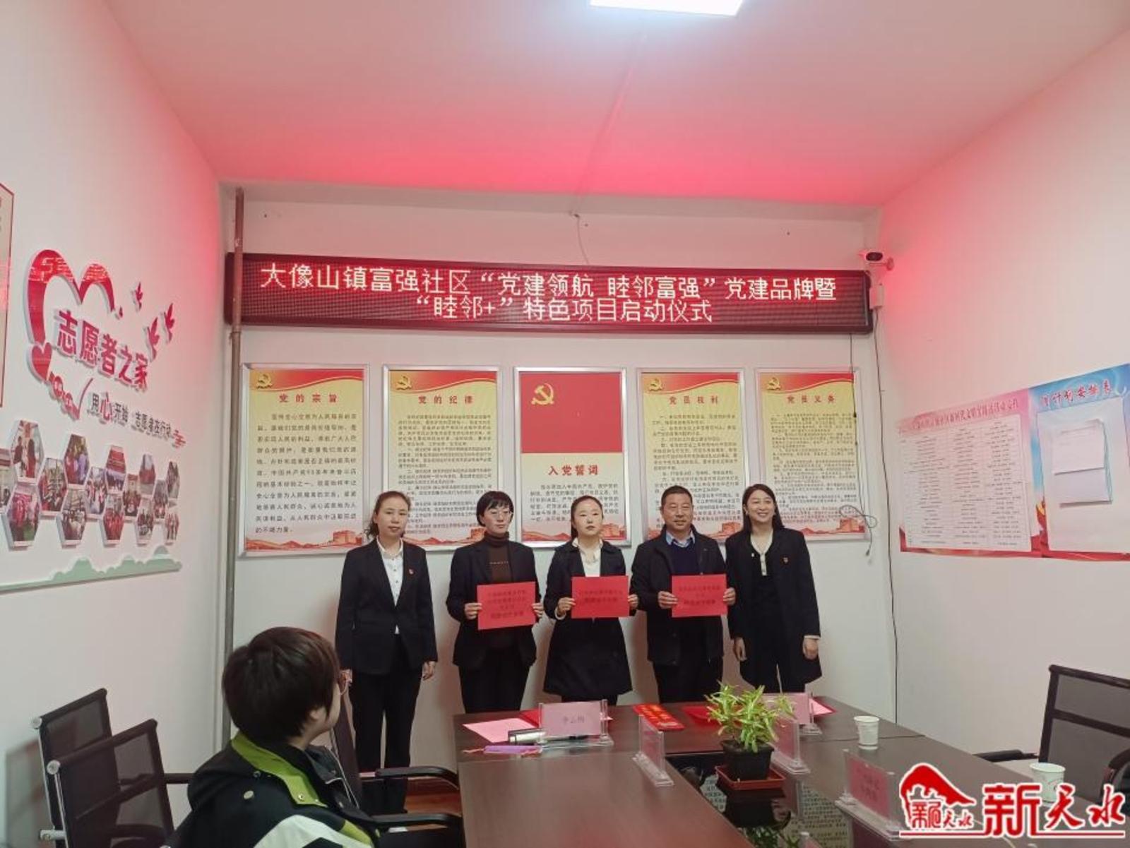 在日前大像山镇富强社区党群服务中心举行的以“党建领航 睦邻富强”为党建品牌的“睦邻+”特色项目启动仪式上,甘谷县尚亿家电有限公司负责人刘尚义、甘谷县哈博早教中心负责人李梅洁、中国邮政集团有限公司甘肃省甘谷县分公司代表人员康妮被聘为“睦邻合伙人”;平价大药房负责人李喜平、天成维修部负责人董霞、兰州陈记牛肉面负责人牛鹏飞、山货市沐浴中心负责人马色力买、勤霞理发店负责人马勤霞获聘“睦邻加油站”负责人,并为社区“邻聚力”志愿服务队授旗。明确社区将根据“睦邻加油站”站点特色和居民需求,以“睦邻合伙人”兜底保障,以“邻聚力”志愿服务队为依托,开展便民服务。