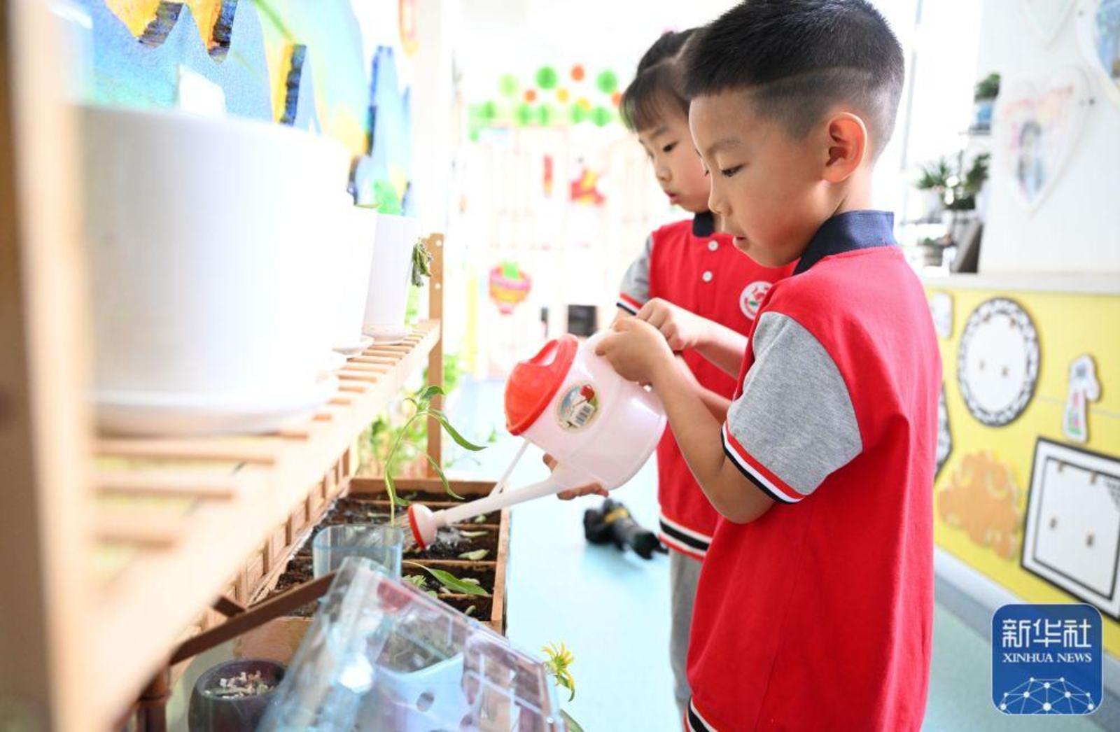 5月31日,在天津市和平区第五幼儿园,小朋友对土培植物进行浇水。新华社记者 赵子硕 摄