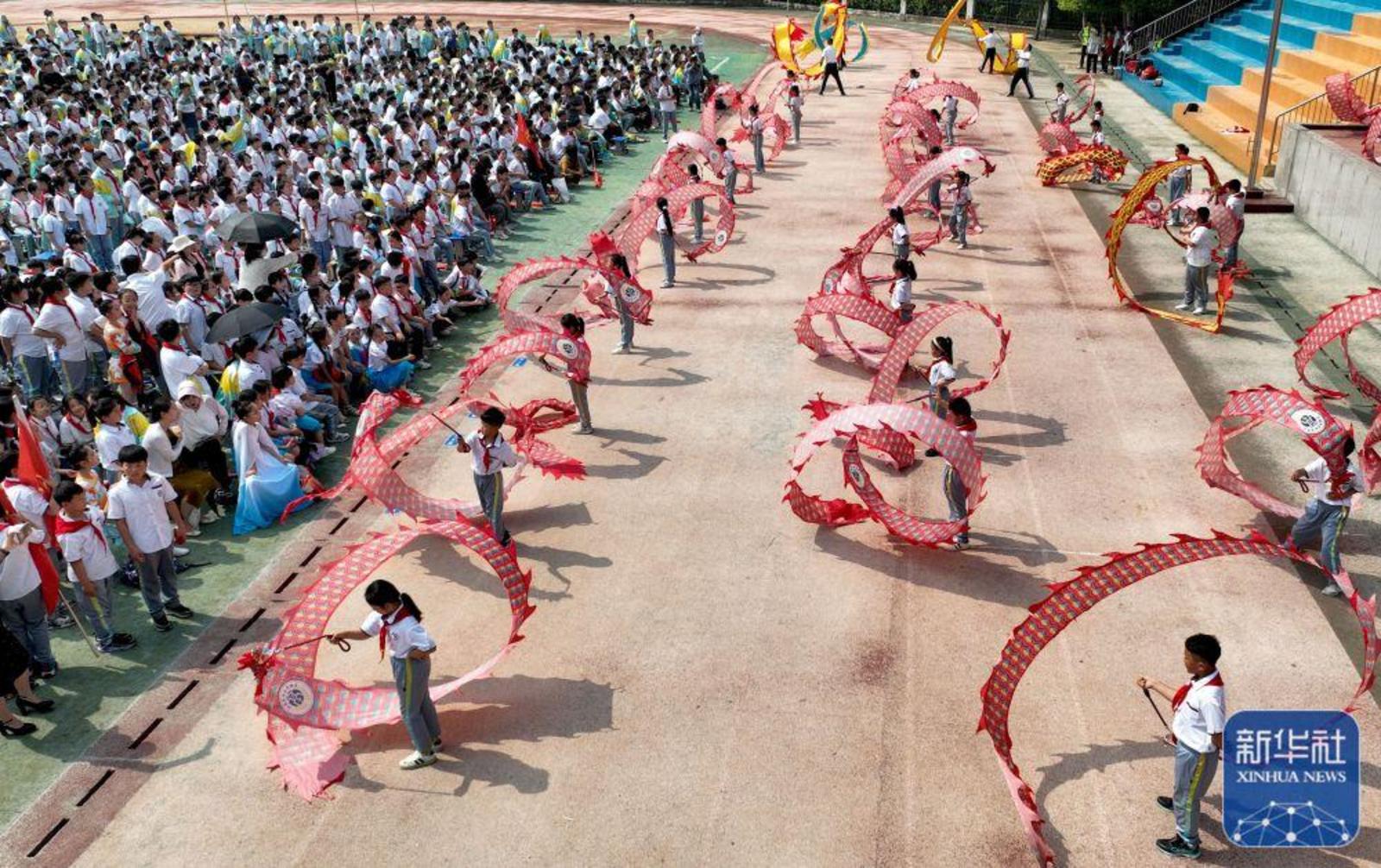 5月31日,在安徽省亳州学院附属学校,孩子们在迎“六一”文艺汇演上表演舞龙。新华社发(刘勤利 摄)