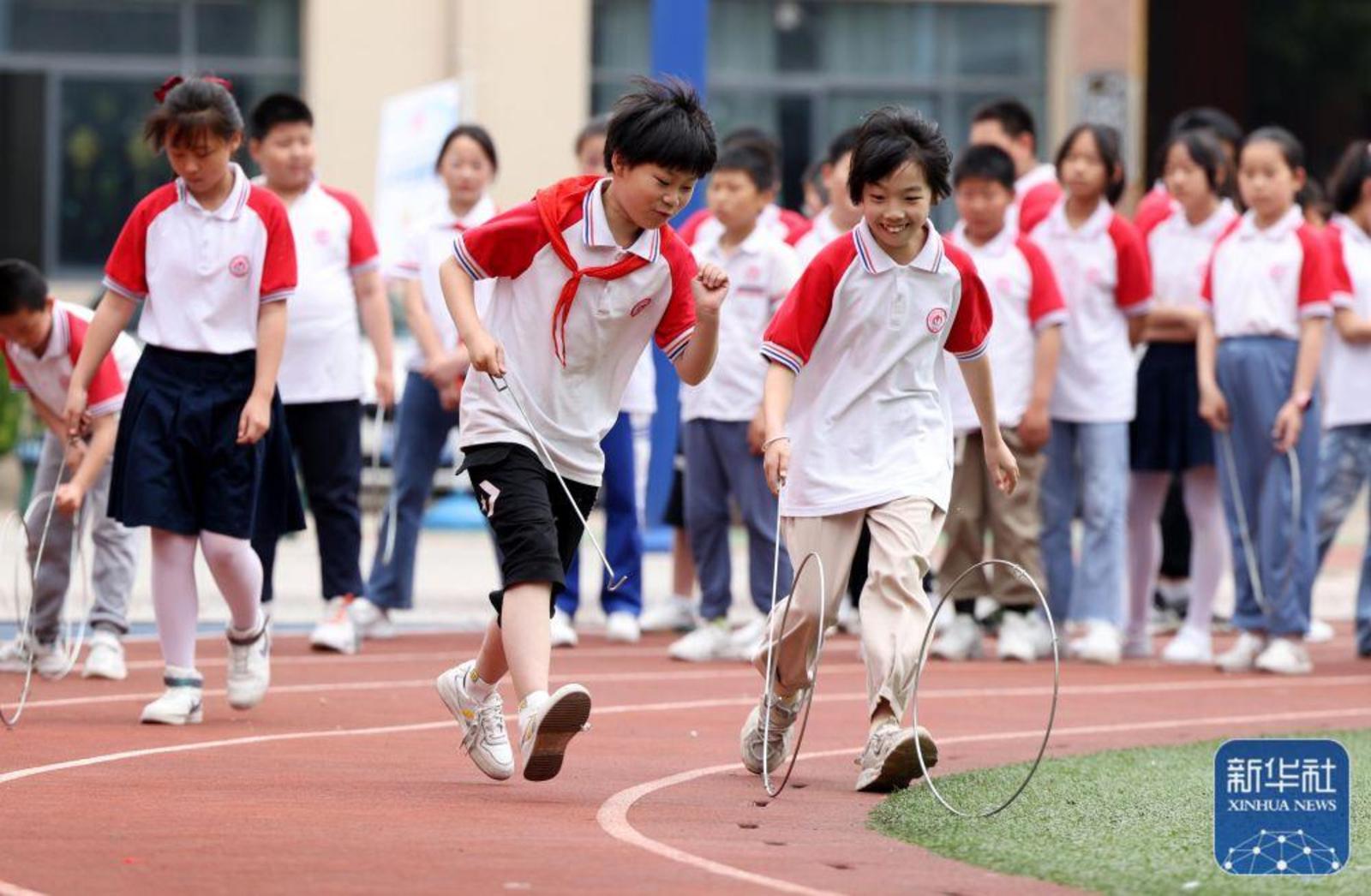 5月31日,在合肥市和平小学第四小学举办的“传统游戏迎六一”活动中,孩子们参加拔河比赛。新华社发(解琛摄)