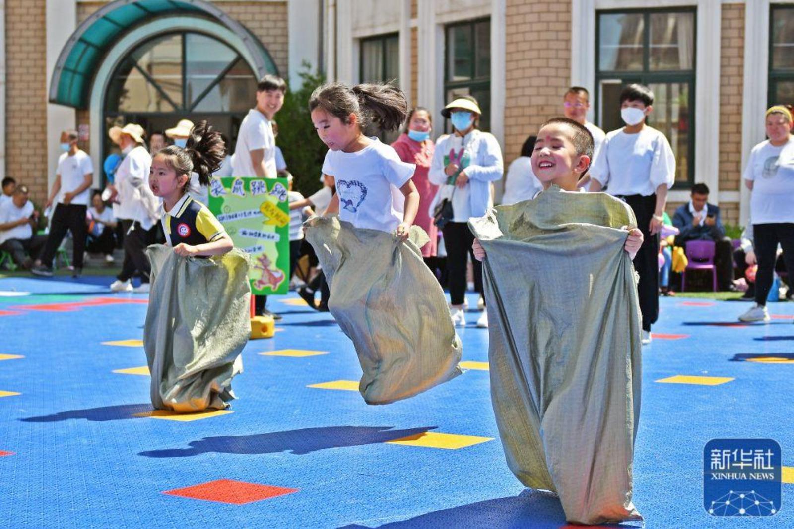 5月31日,山东省烟台市福山区清洋街道中心幼儿园的小朋友参加“袋鼠跳跳”趣味游戏。新华社发(孙文潭 摄)
