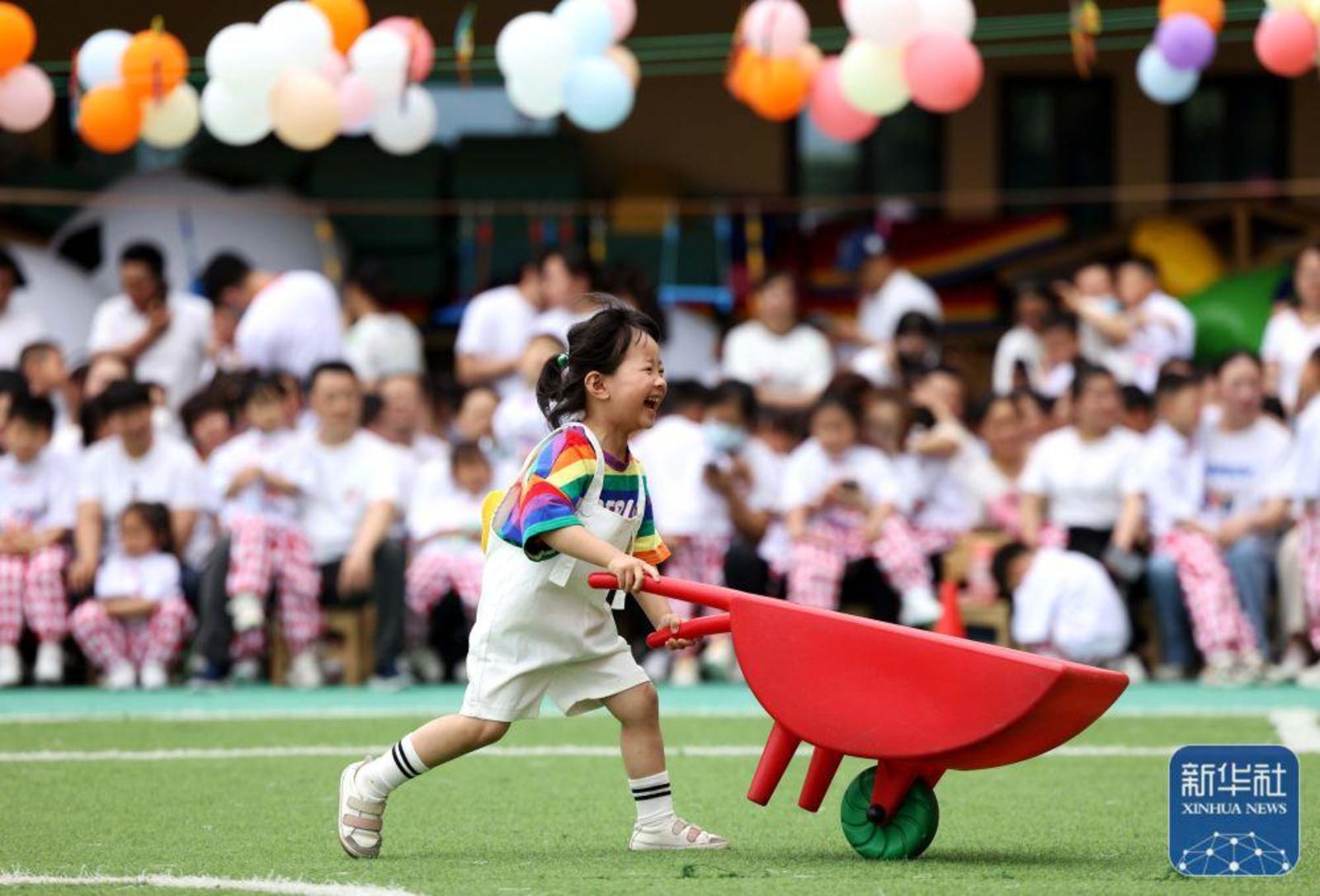 5月31日,在合肥市长江东大街幼儿园举办的“萌娃迎六一”活动中,小朋友参加趣味推车游戏。新华社发(解琛摄)