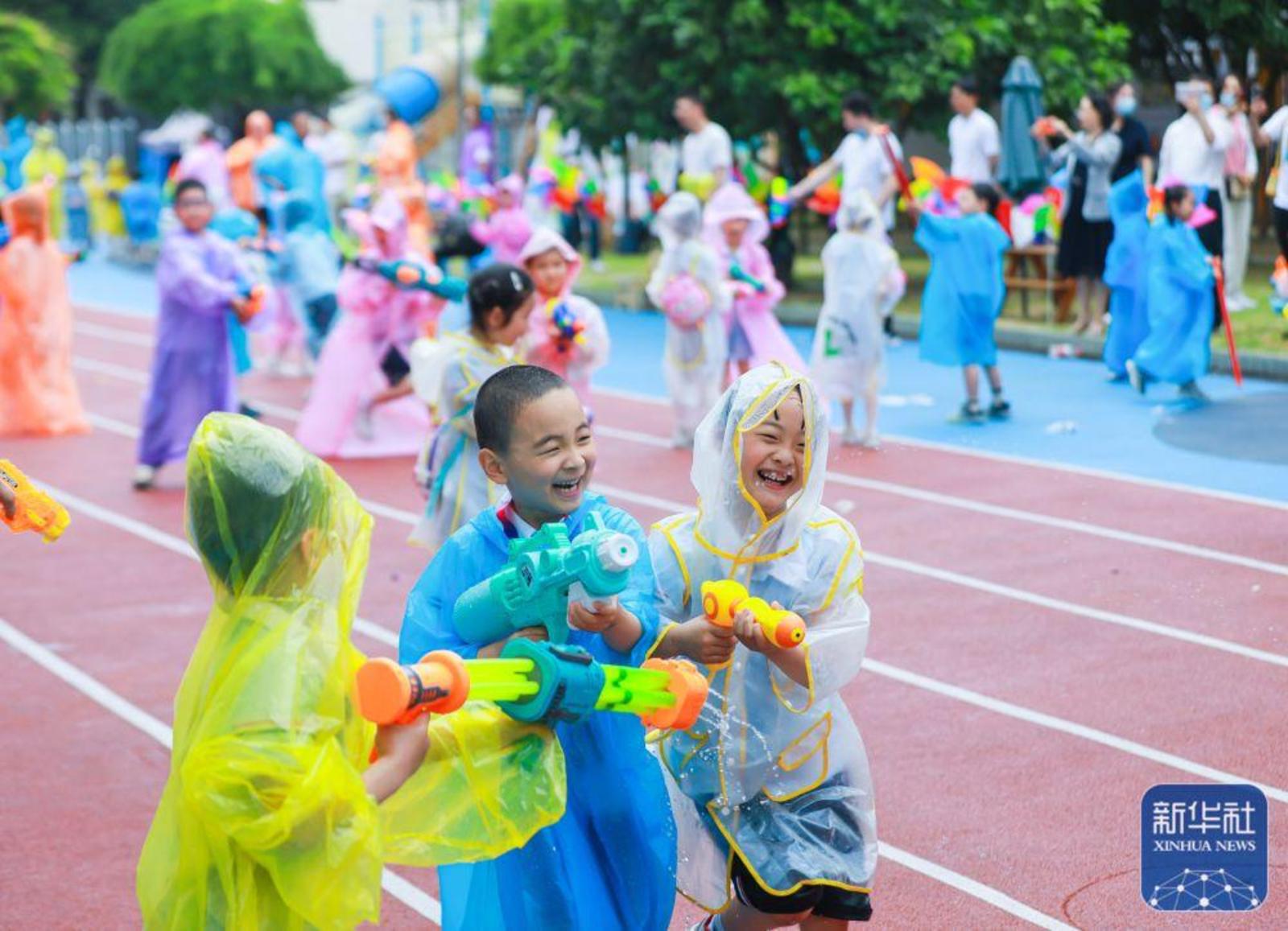 5月31日,贵州省铜仁市玉屏侗族自治县第三幼儿园的小朋友在玩水枪。新华社发(胡攀学摄)