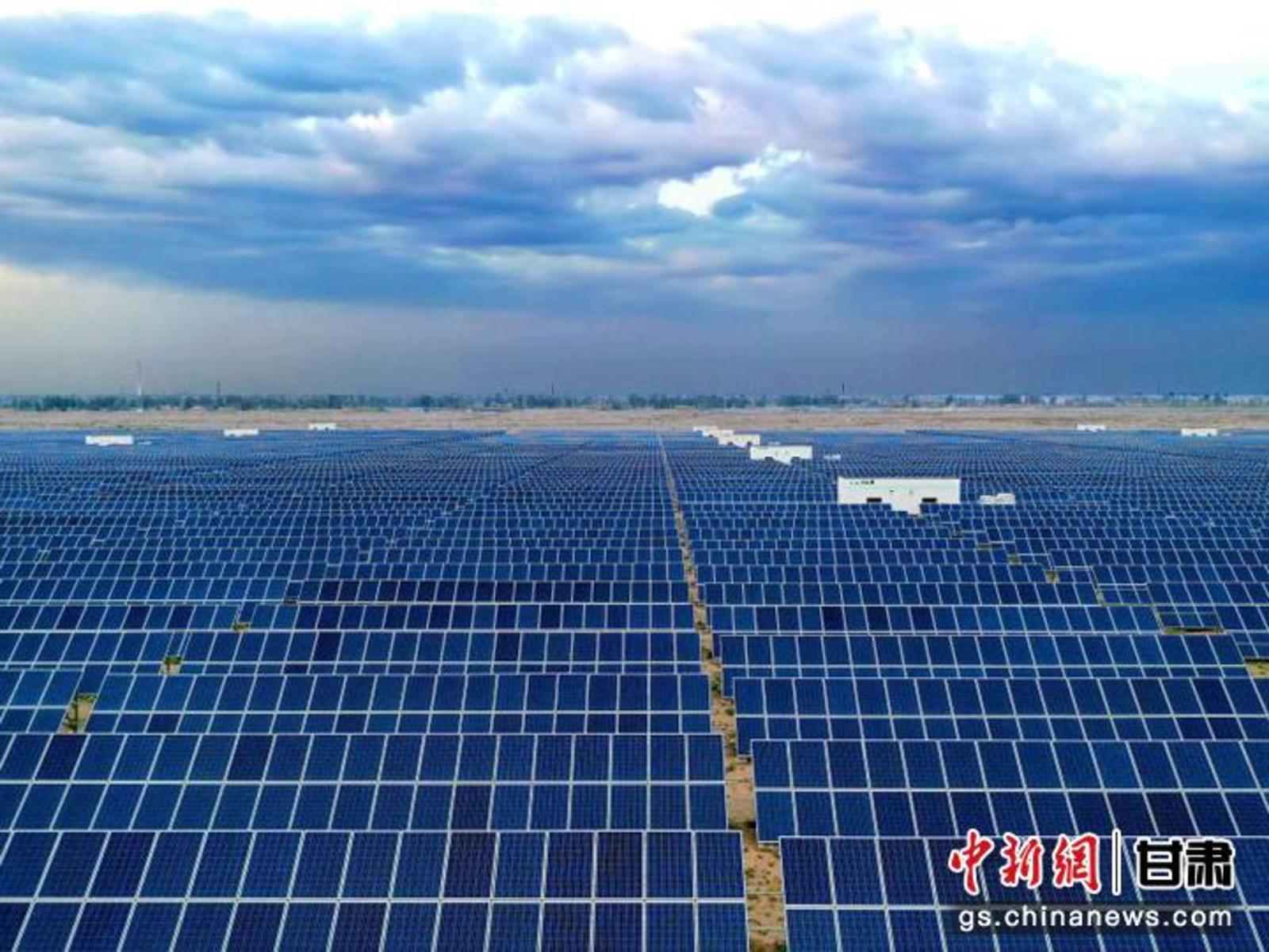 在金塔县红柳洼光电产业园,辽阔的戈壁上一座座输电铁塔架起的电线纵横交错,一直延伸到远处的天际线,一排排整齐排列的太阳能光伏板在阳光下格外“绚烂”,目之所及,皆是一片“蓝海”。