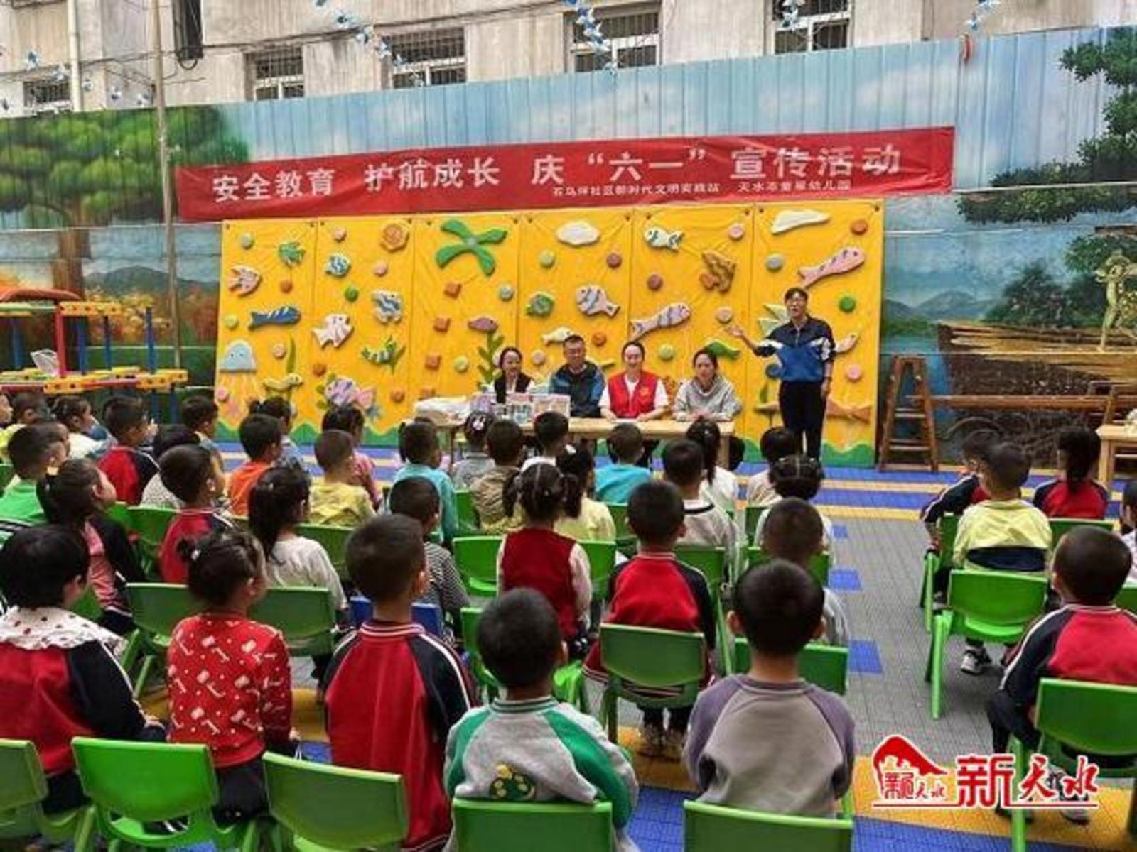 新天水讯【记者张玉平】5月31日,秦州区石马坪街道石马坪社区党委、石马坪社区新时代文明实践站联合童星幼儿园开展了“安全教育•护航成长”安全常识宣传活动,进一步提高学龄前儿童的安全防范意识和自我保护能力,织牢织密儿童安全网,合力为孩子们撑起安全“保护伞”。