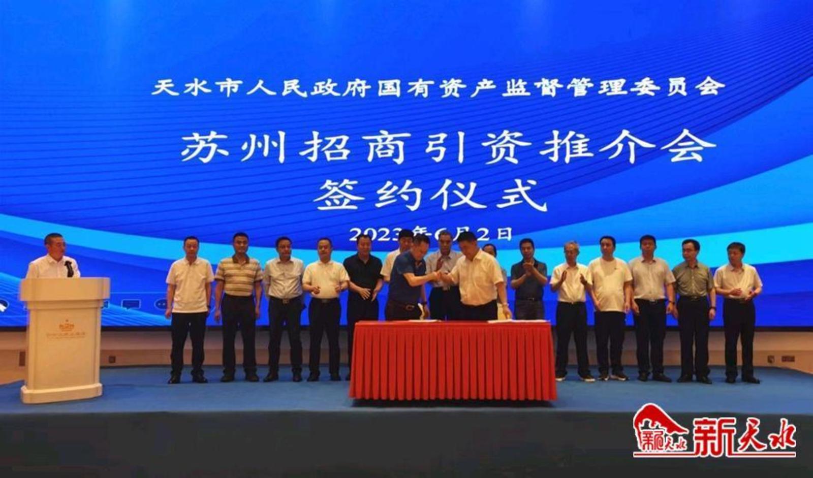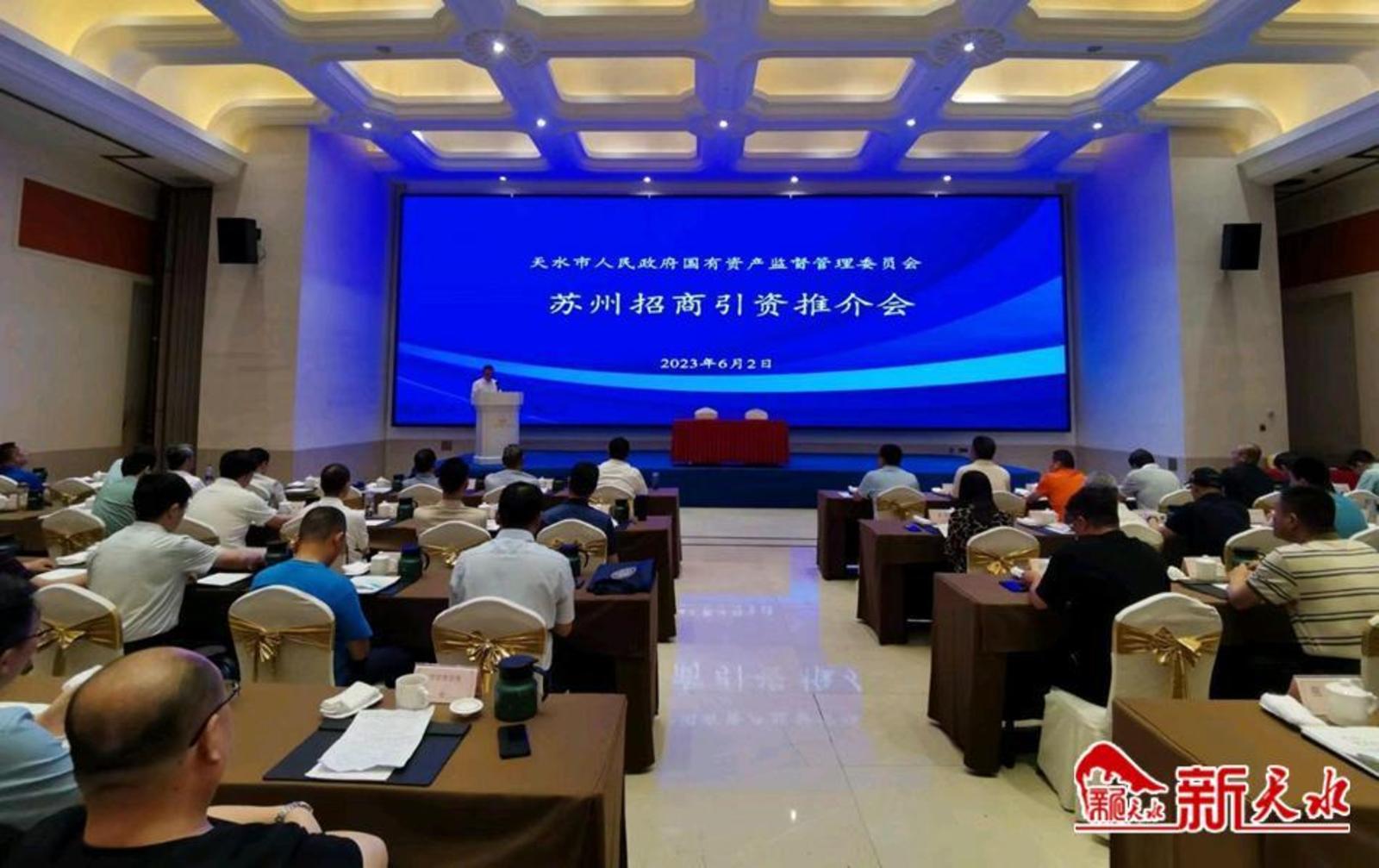 新天水讯 6月2日,天水市政府国资委在江苏苏州成功举办招商引资推介会。天水市政府国资委主要领导,天水市江苏商会、苏州市甘肃商会、苏州市盐城商会和苏州市山东商会相关人士,天水市属国有企业、苏州有关企业负责人约100人参加推介会。