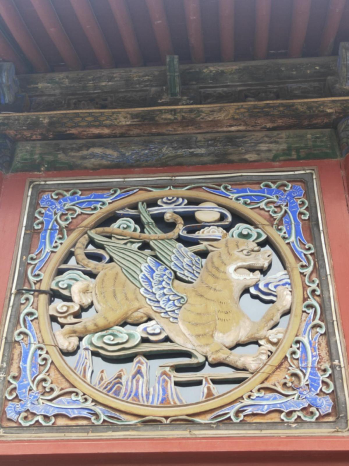 戏楼二楼为戏台,其当心间安装六抹活扇隔扇门,唱戏时这些门扇可以临时取下。二楼檐下装透雕栱间板,雕刻内容有莲花、牡丹、二龙捧寿等,寓意福寿连连、富贵清廉。两尽间槛窗镂雕翼龙、翼虎图案。虎啸而风生,风生而万籁皆作,虎伏而风止,风止而万籁皆息。而《博雅》《释鱼》中言:“有翼曰应龙”。可见,这翼龙翼虎暗含风调雨顺的美好期盼。