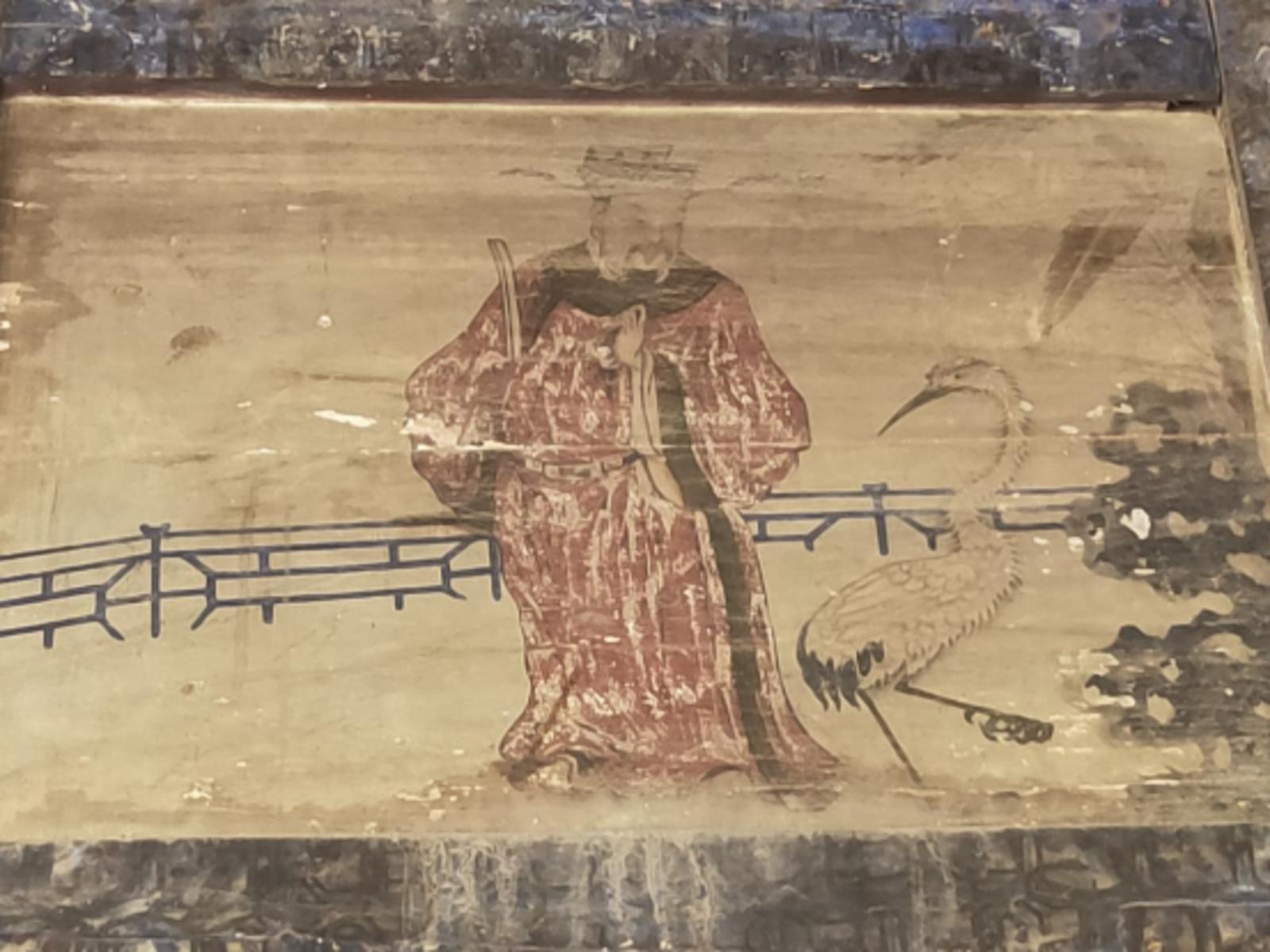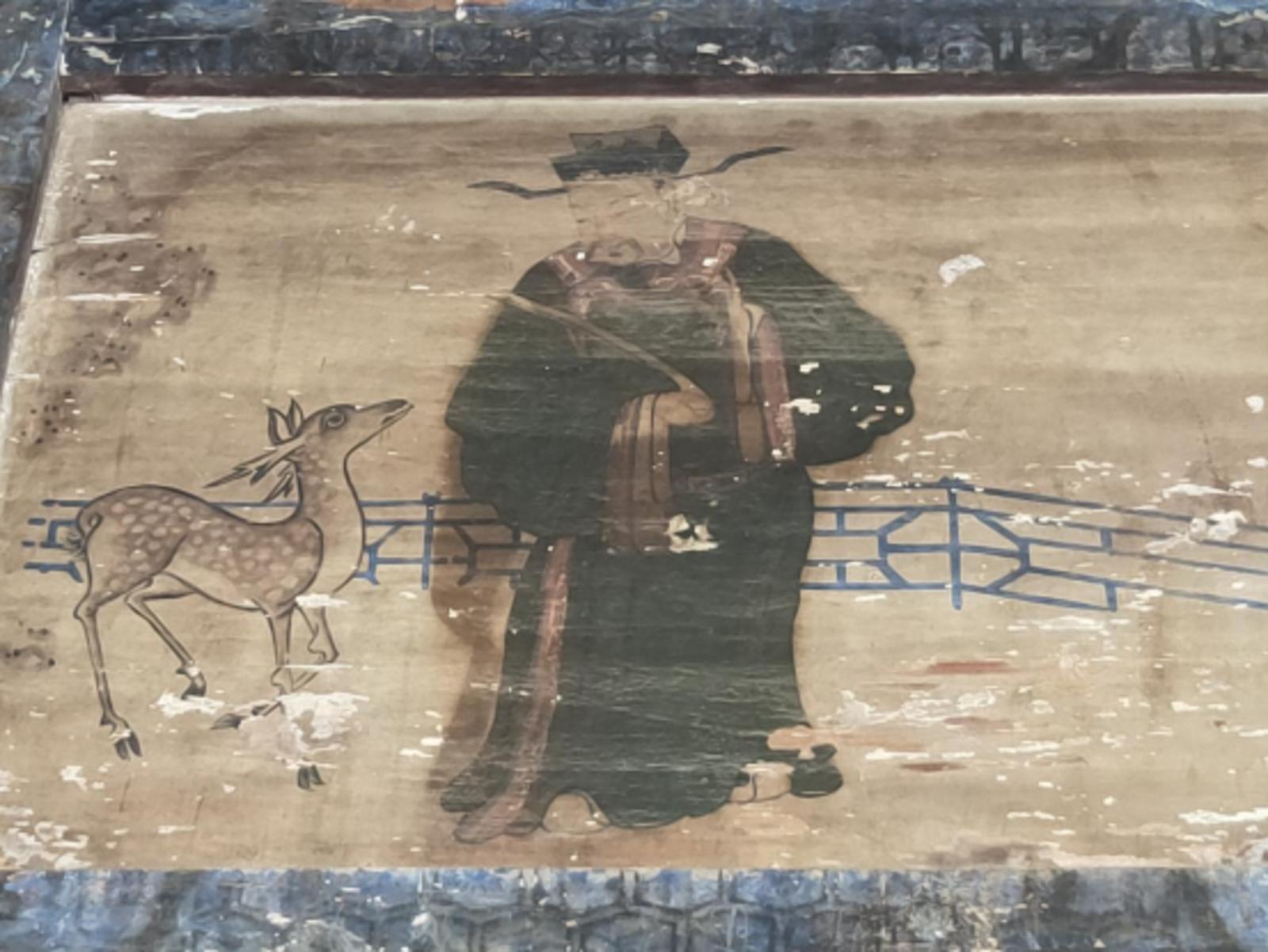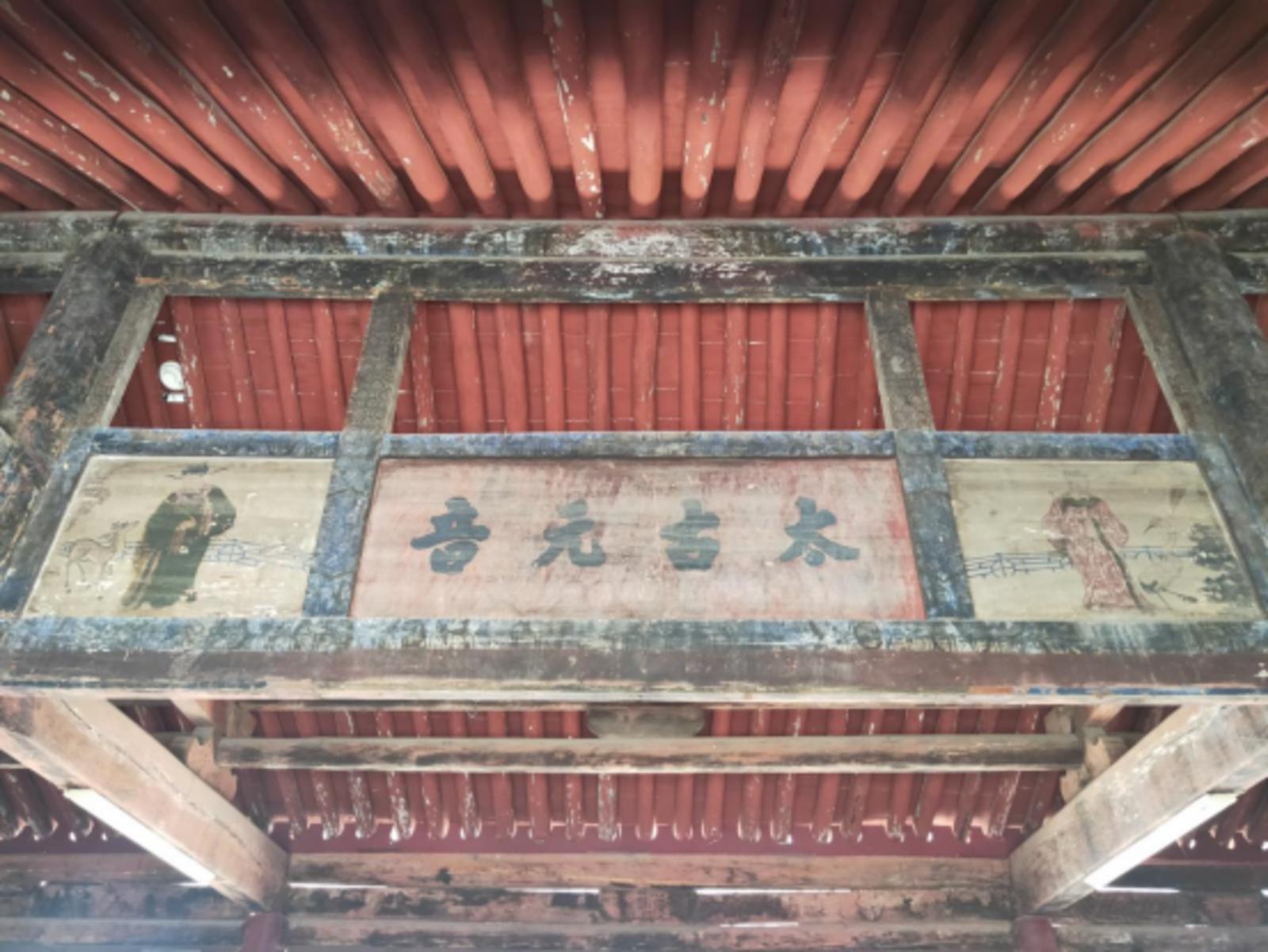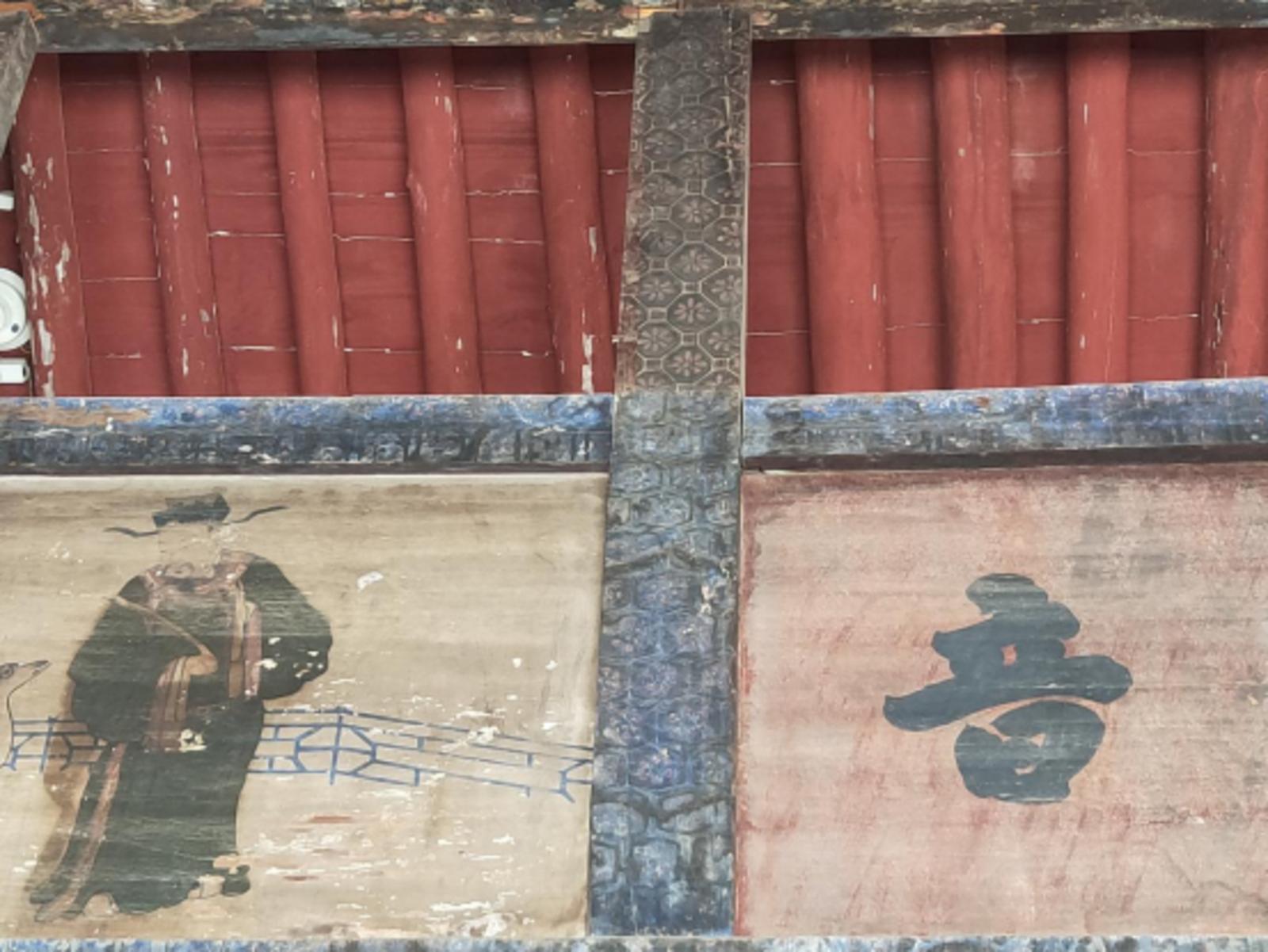 戏楼内二帘额板和梁柱上较好地保存了许多清代彩画,其中以墨书“太古元音”和彩画天官赐福图最为精彩。