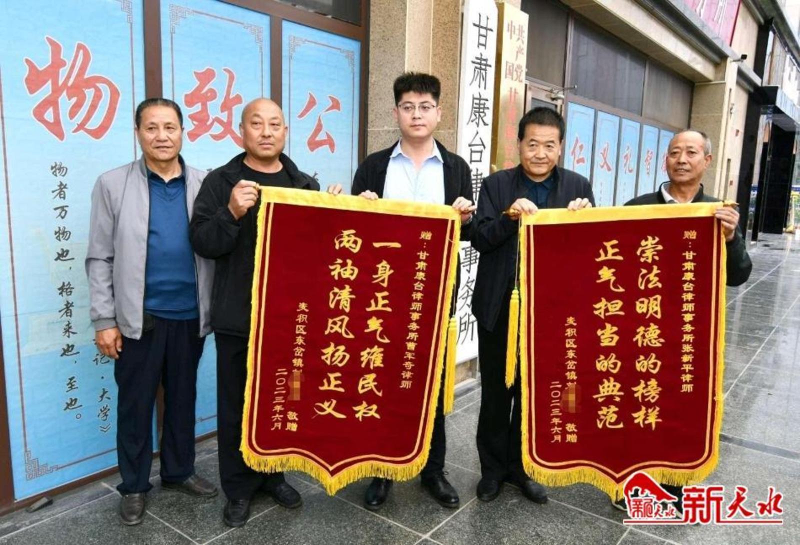 新天水讯【特约通讯员窦耀辉】6月5日,麦积区东岔镇村民刘某某来到甘肃康台律师事务所,将两面锦旗分别送到该所张新平、曹军奇两位律师手中,对他们表示感谢。