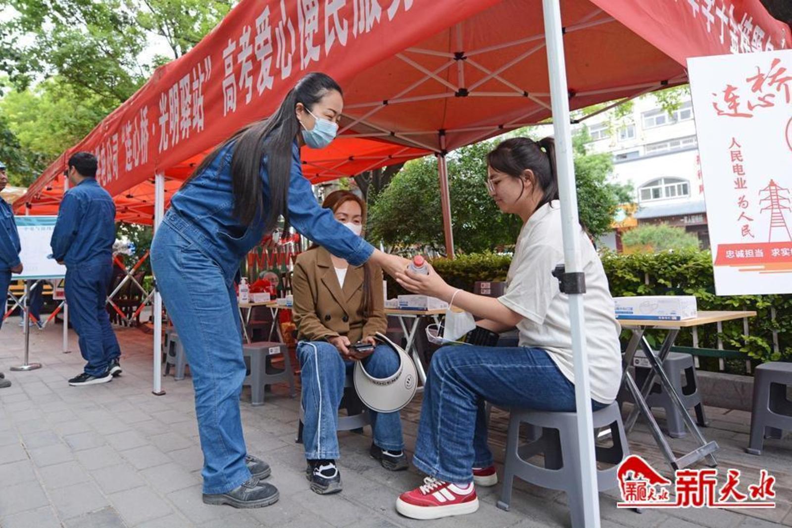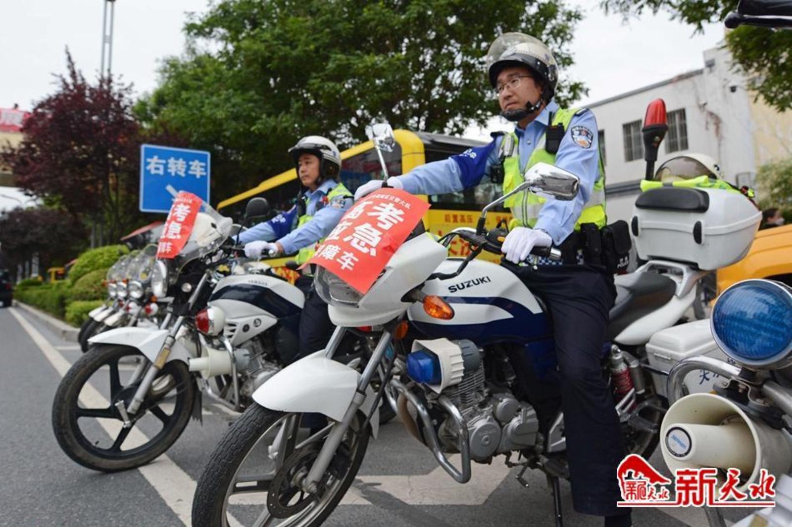 交警高考应急服务车、电力公司供电保障车、志愿者爱心送考车在考场外值守。各部门、全社会为高考保驾护航。