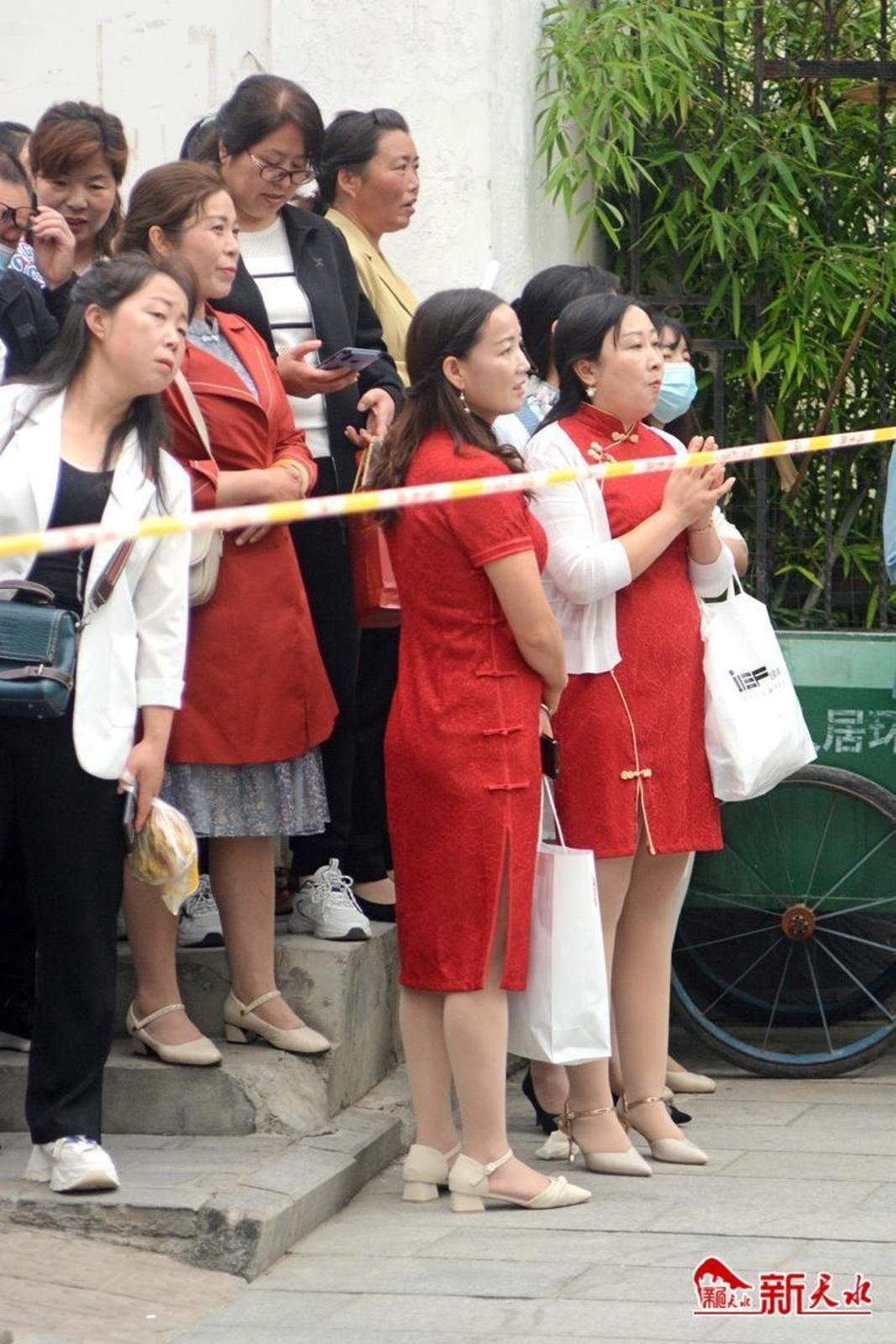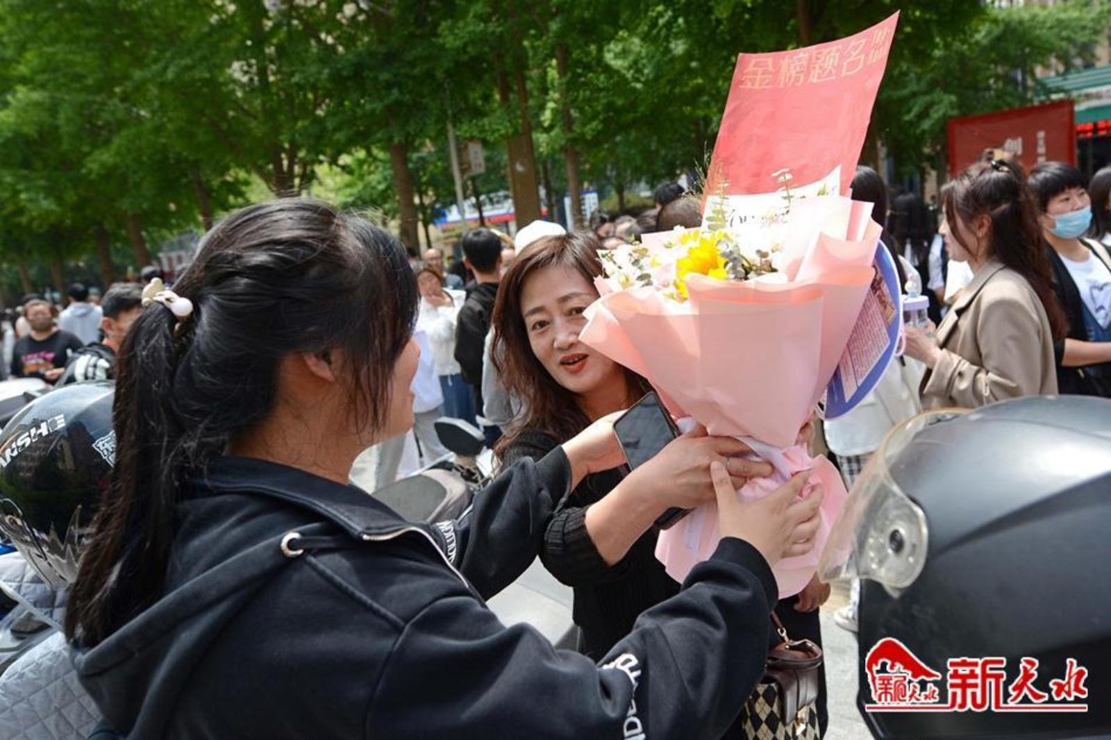 当天,在市一中和市六中考点外,有几位妈妈特意穿了旗袍、手捧鲜花接孩子出考场,祝愿考生旗开得胜。