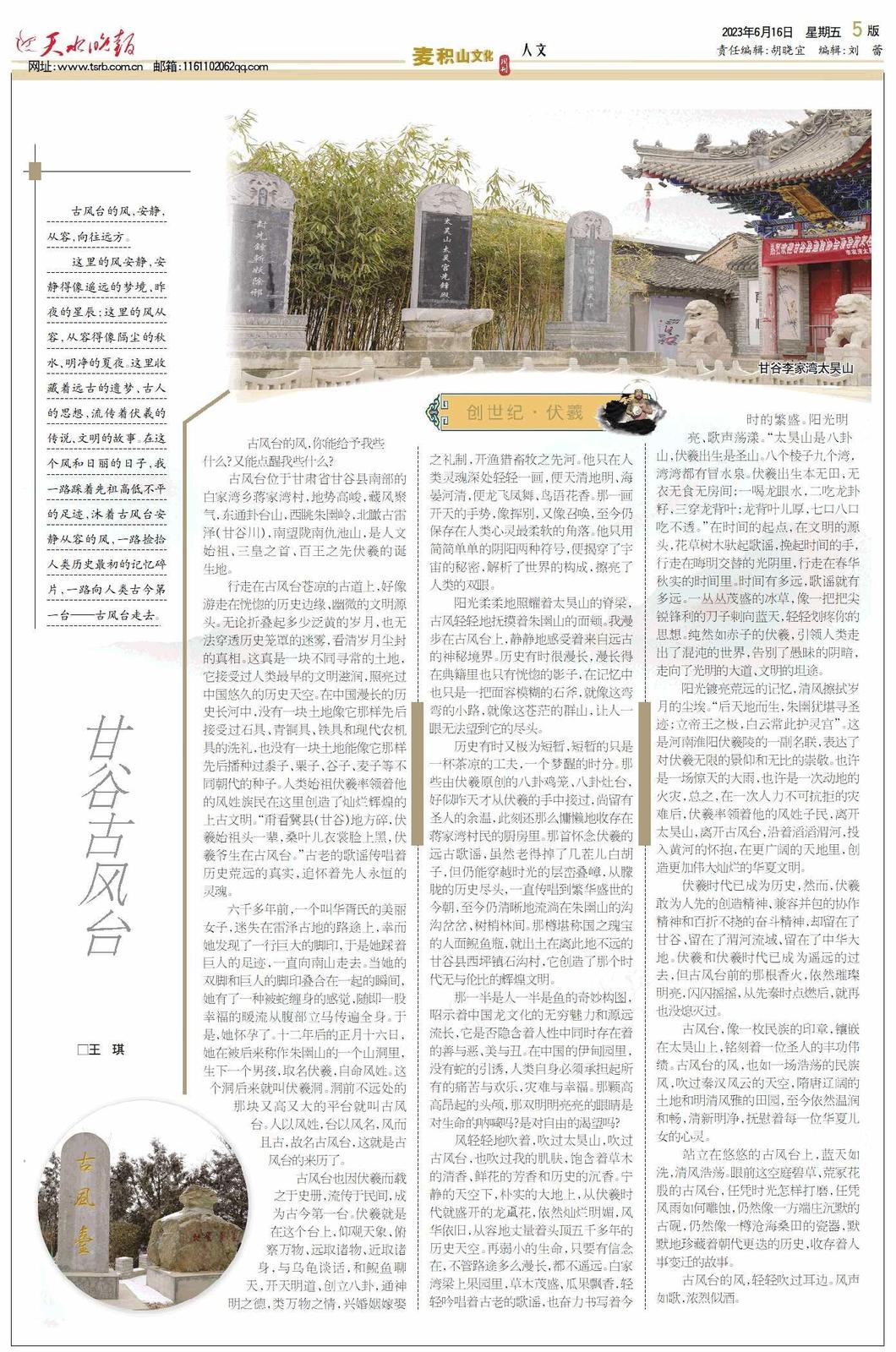 行走在古风台苍凉的古道上,好像游走在恍惚的历史边缘、幽微的文明源头。无论折叠起多少泛黄的岁月,也无法穿透历史笼罩的迷雾,看清岁月尘封的真相。这真是一块不同寻常的土地,它接受过人类最早的文明滋润,照亮过中国悠久的历史天空。在中国漫长的历史长河中,没有一块土地像它那样先后接受过石具、青铜具、铁具和现代农机具的洗礼,也没有一块土地能像它那样先后播种过黍子、粟子、谷子、麦子等不同朝代的种子。人类始祖伏羲率领着他的风姓族民在这里创造了灿烂辉煌的上古文明。“甭看冀县(甘谷)地方碎,伏羲始祖头一辈,桑叶儿衣裳脸上黑,伏羲爷生在古风台。”古老的歌谣传唱着历史荒远的真实,追怀着先人永恒的灵魂。