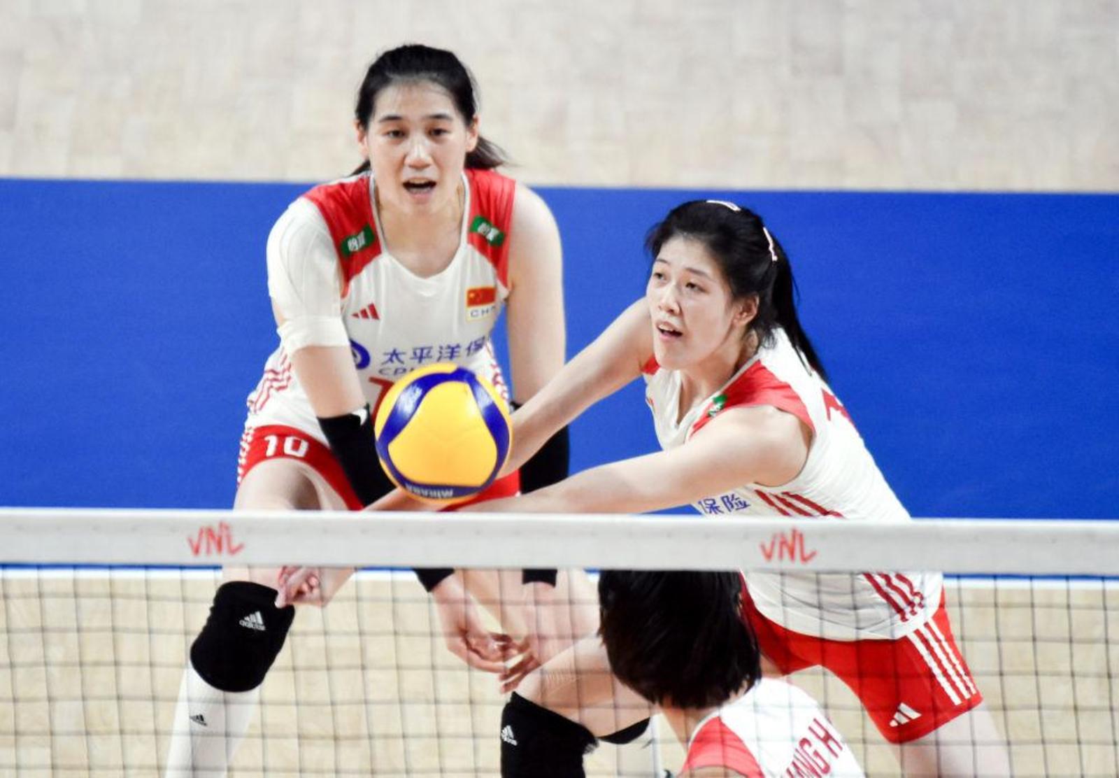 6月17日,中国队球员李盈莹(右)在比赛中垫球。新华社记者卢炳辉摄