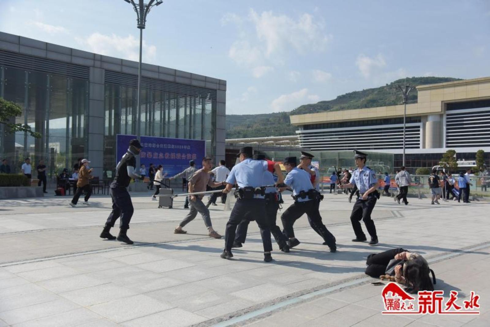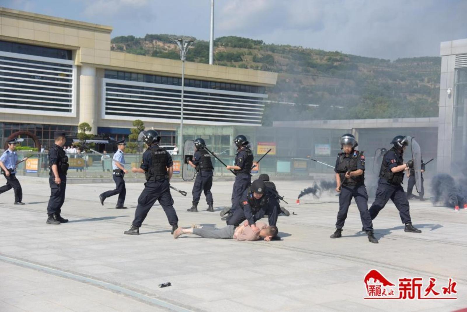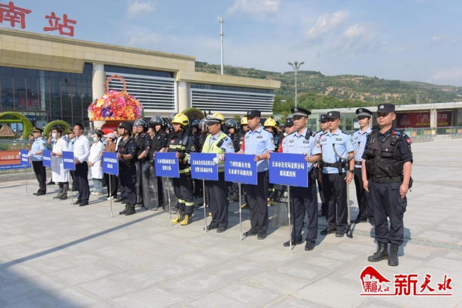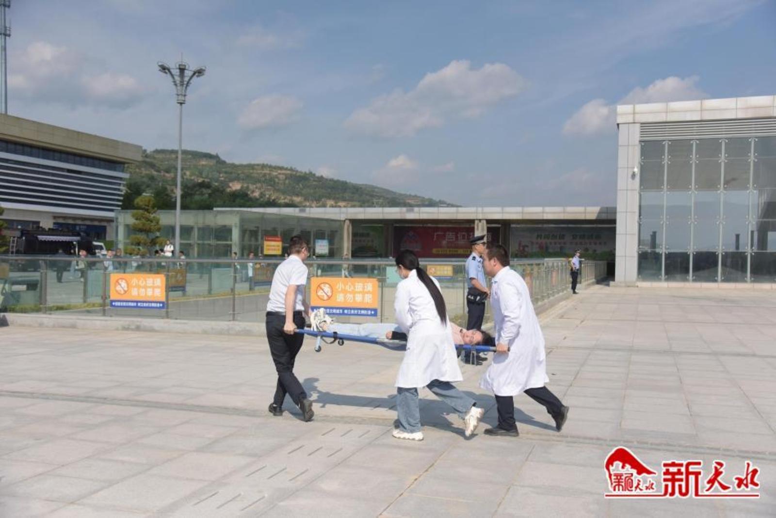 原来,这是天水市公安局麦积分局联合区消防、急救、天水交发实业有限公司等部门在天水南站站前广场开展的反恐防暴应急救援联合演练。