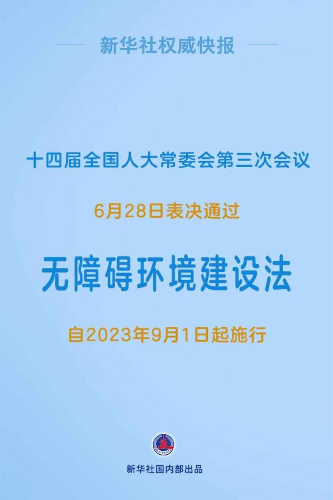 6月28日,十四届全国人大常委会第三次会议表决通过无障碍环境建设法。