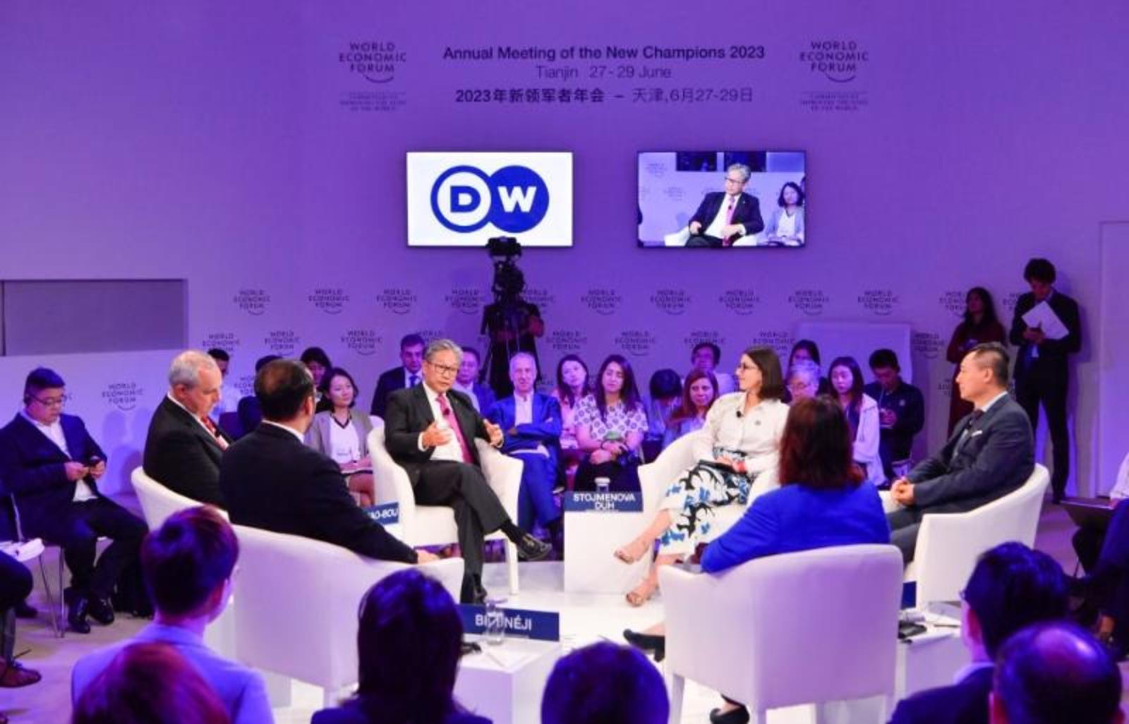 6月28日,在天津梅江会展中心,嘉宾在“直面挑战:在脆弱的环境中重启增长”对话会上交流讨论。新华社记者 孙凡越 摄
