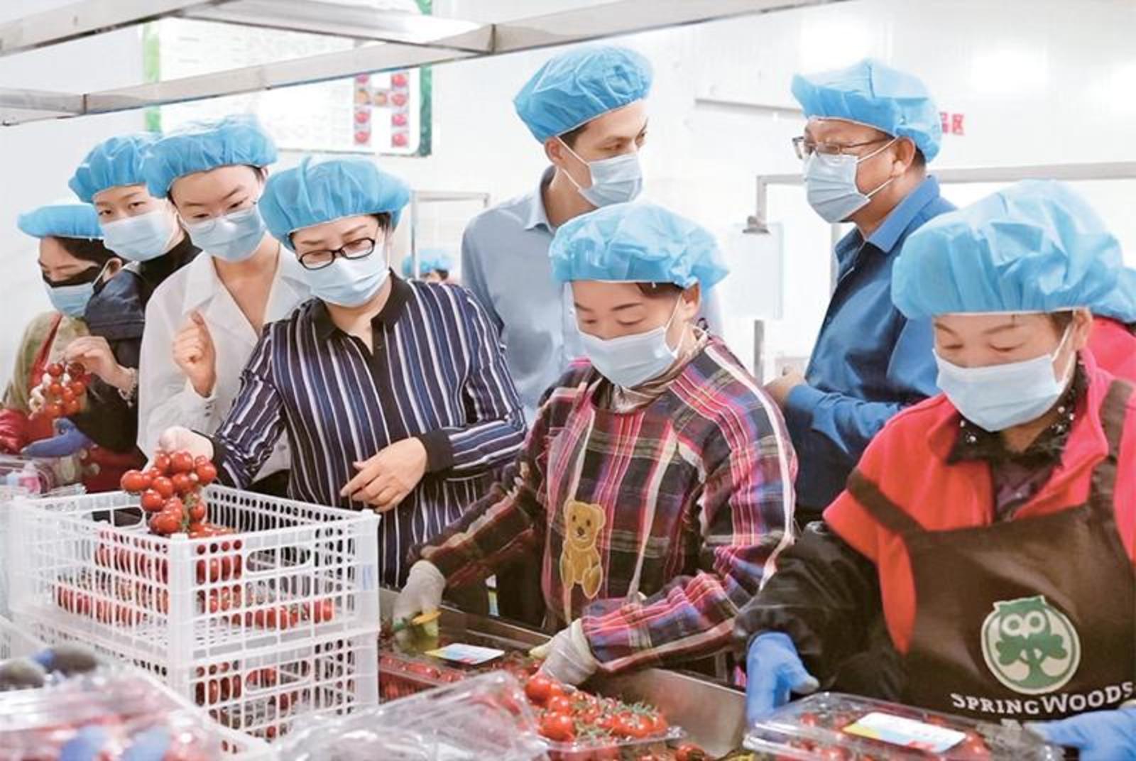 图为2023年5月15日,云南大理春沐源农业科技有限公司包装车间内,中华全国总工会赴云南蹲点工作组开展“进车间劳动 交工人朋友”实践活动,深入公司生产一线,与工人一同进行产品包装。 云南省总工会供图 王自强/摄
