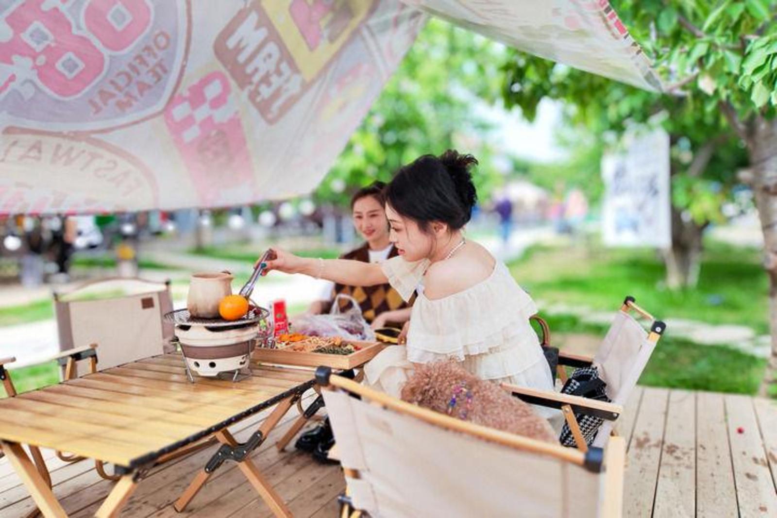 四周草木葱郁,一张天幕下,31岁的天水市民赵思路和闺蜜正坐在椅子上煮茶,享受午后惬意时光。