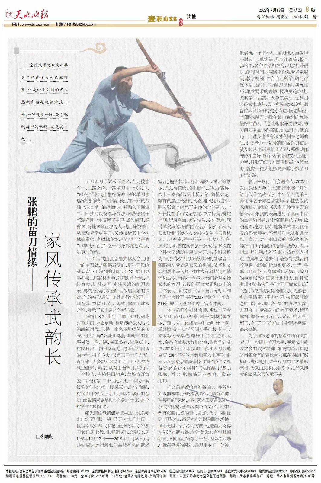为了回报老师的指点和所有支持者,进一步提升苗刀水平,展示武山武术之乡的武术精神,张鹏的苗刀和他父亲张金有的春秋大刀都在不断打磨提升。期待他们父子双刀的下次精彩亮相,为武山武术再添光彩,把尚武传武的家风永远传承下去。