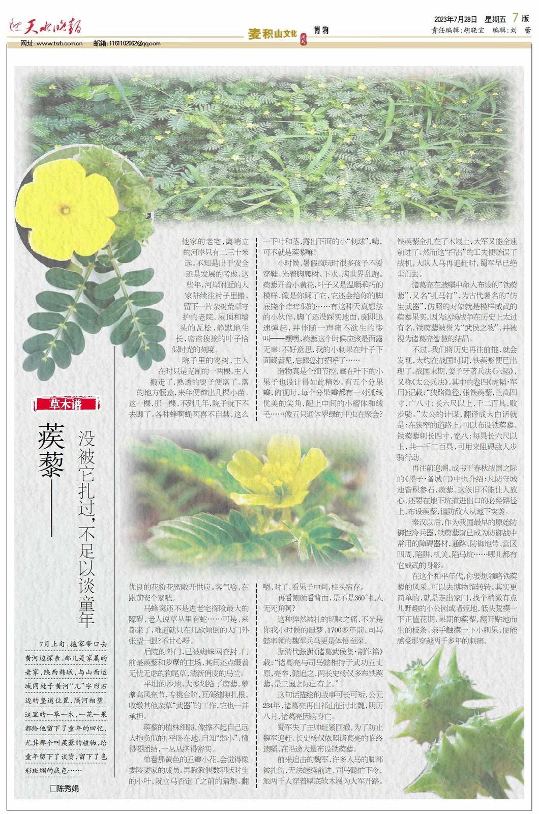 在这个和平年代,你要想领略铁蒺藜的风采,可以去博物馆转转。其实更简单的,就是走出家门,找个稍微有点儿野趣的小公园或者荒地,低头踅摸一下正值花期、果期的蒺藜,翻开贴地而生的枝条,亲手触摸一下小刺果,便能感受那穿越两千多年的刺痛。