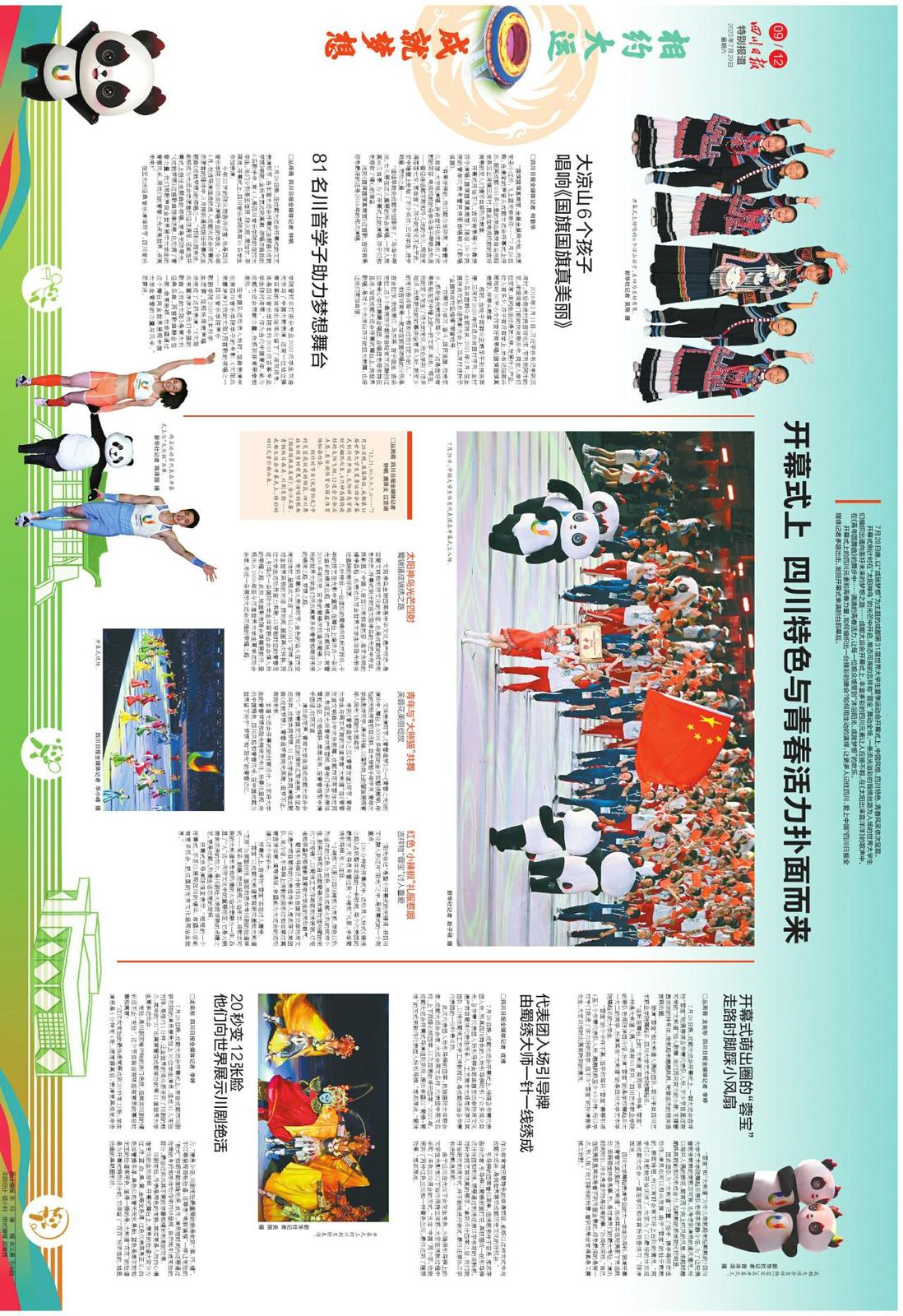 特别推荐今天的版面内容。前4个连版(共8个版),浓墨重彩呈现大运会重要时政新闻。第5个连版,可详看大运会开幕式上的四川元素。第6个连版,可细品大运会开幕式上的科技含量。第7个连版,详细介绍了今日赛事看点,和未来夺金点。第8个连版,一起回味开幕式上精彩瞬间。