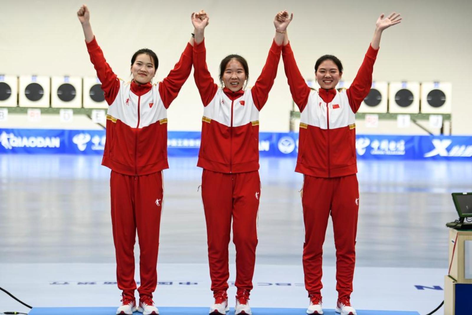 8月1日,中国队选手熊亚瑄、林雅茜、王珂怡(从左至右)在颁奖仪式上庆祝。当日,在成都大运会射击女子25米手枪比赛中,她们获得团体冠军。新华社记者曹祎铭摄