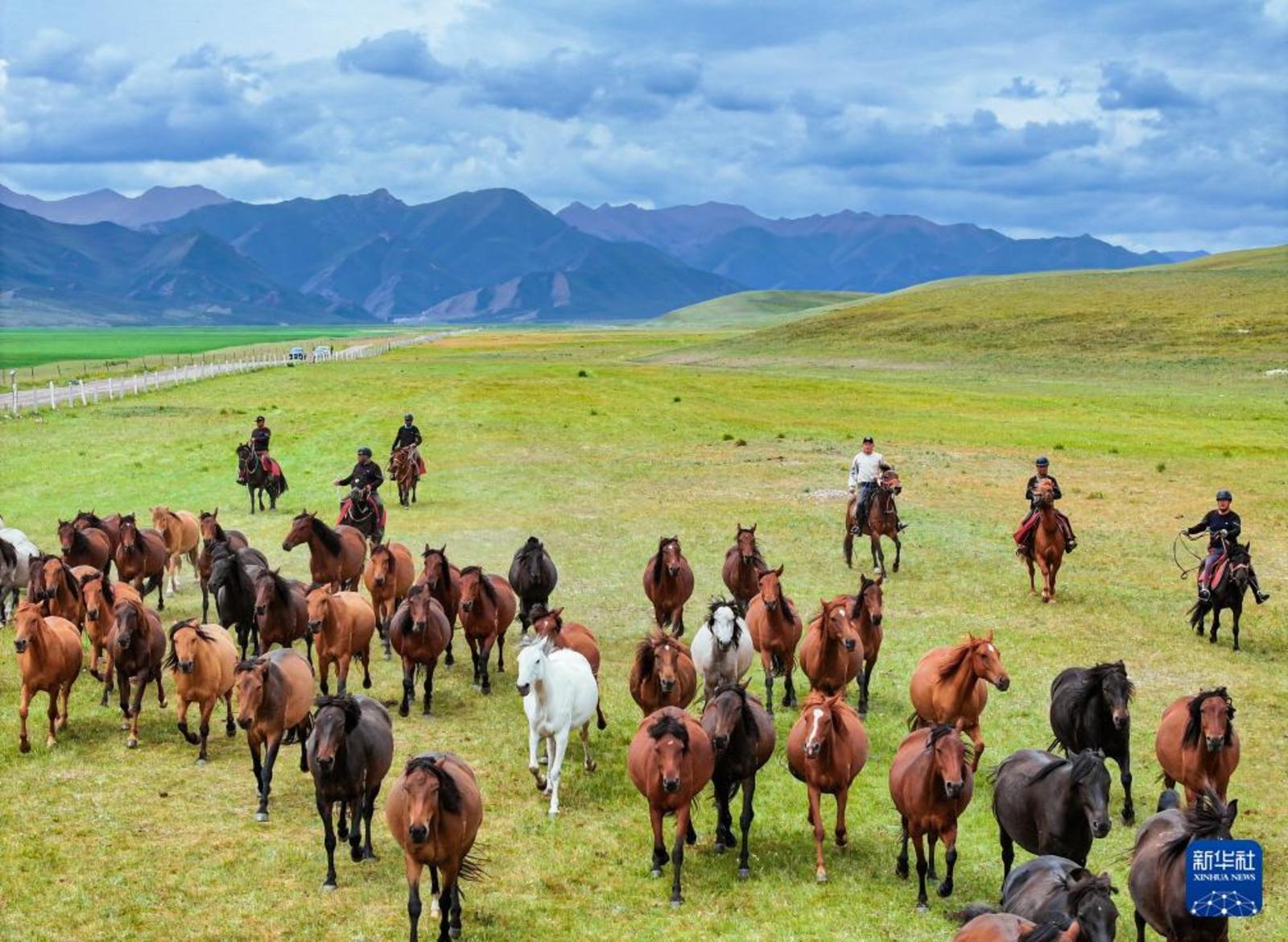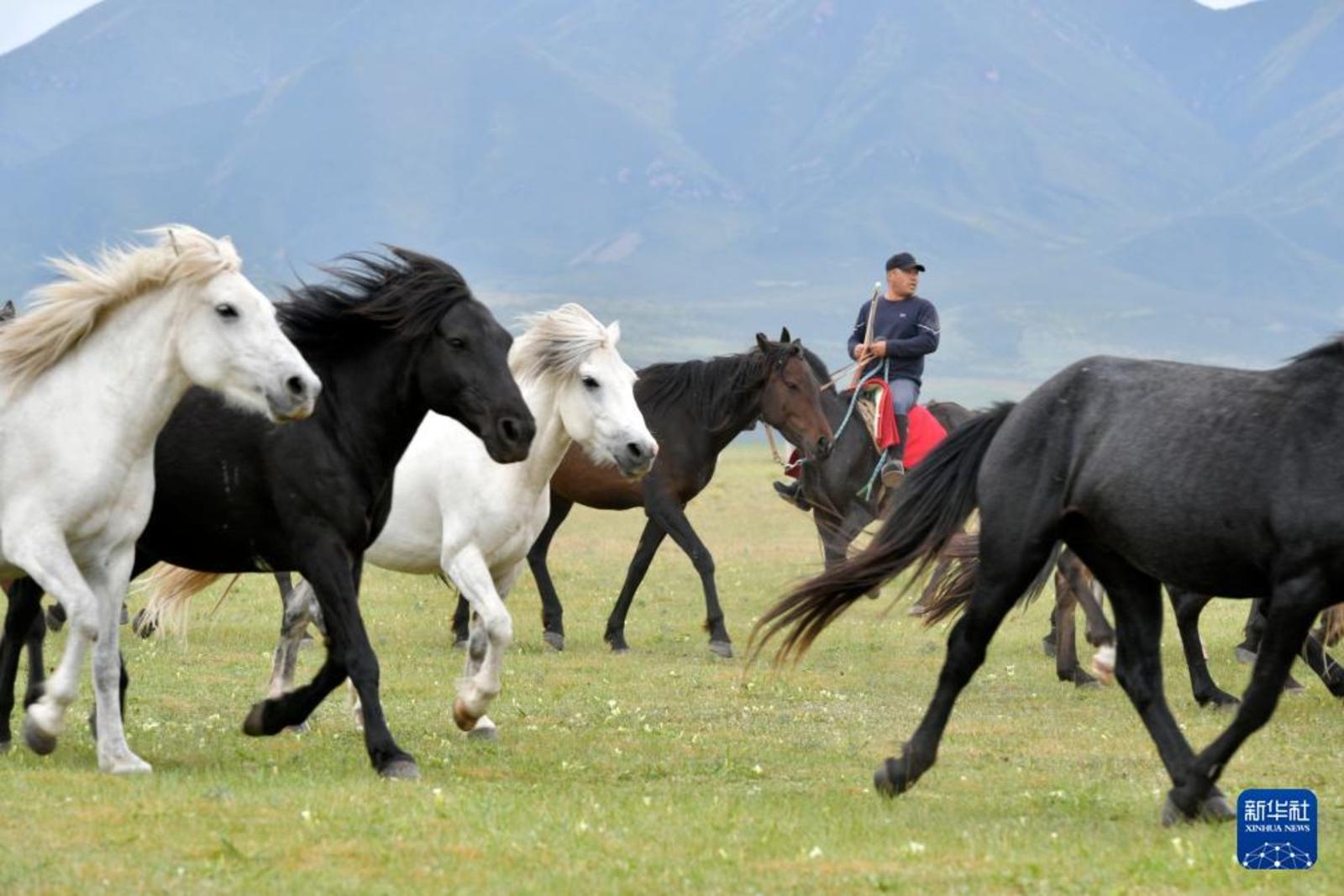 8月6日,在山丹马场一场有限责任公司,牧马人驱赶马群。新华社记者 范培珅 摄