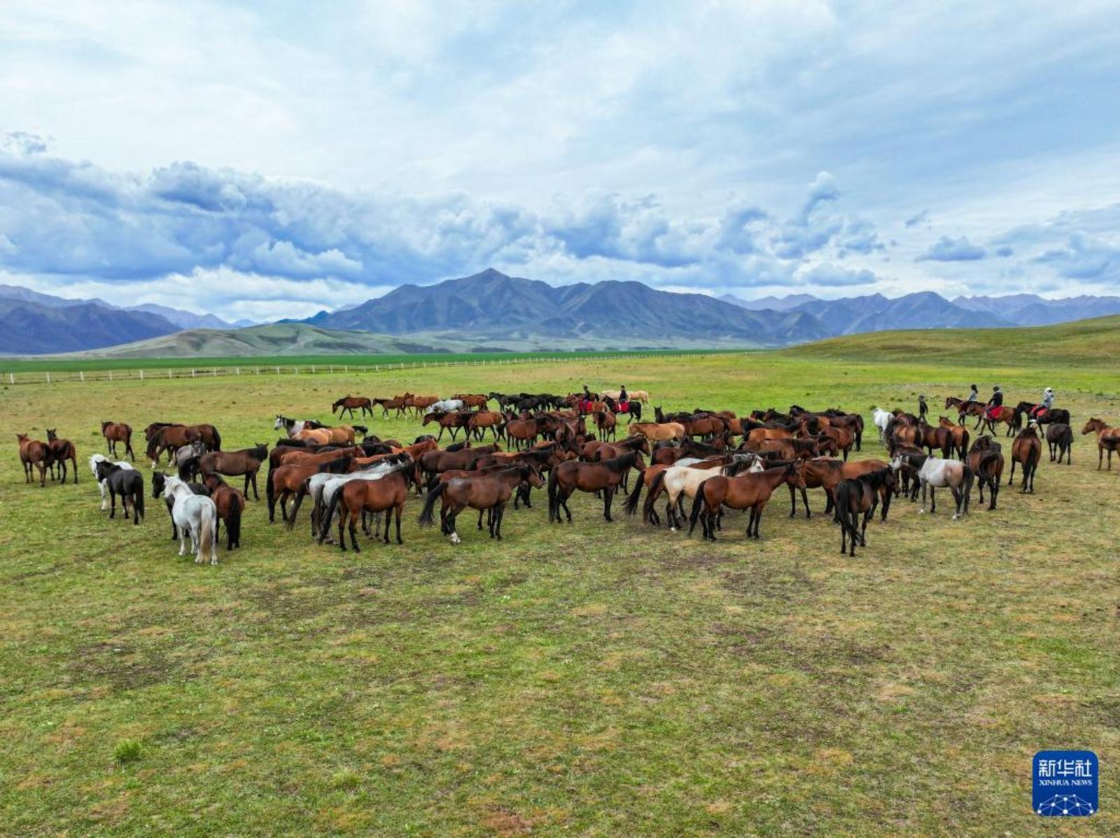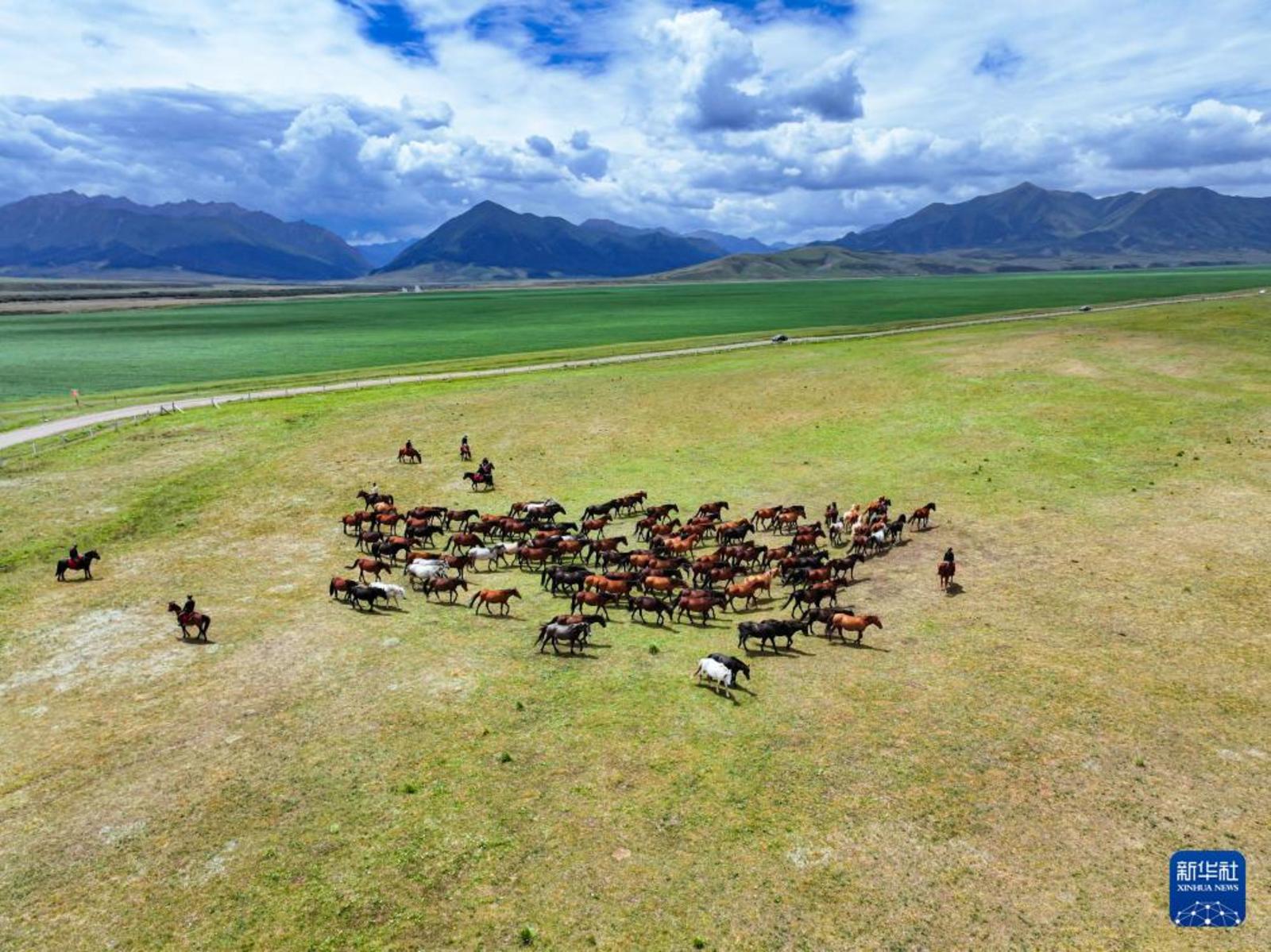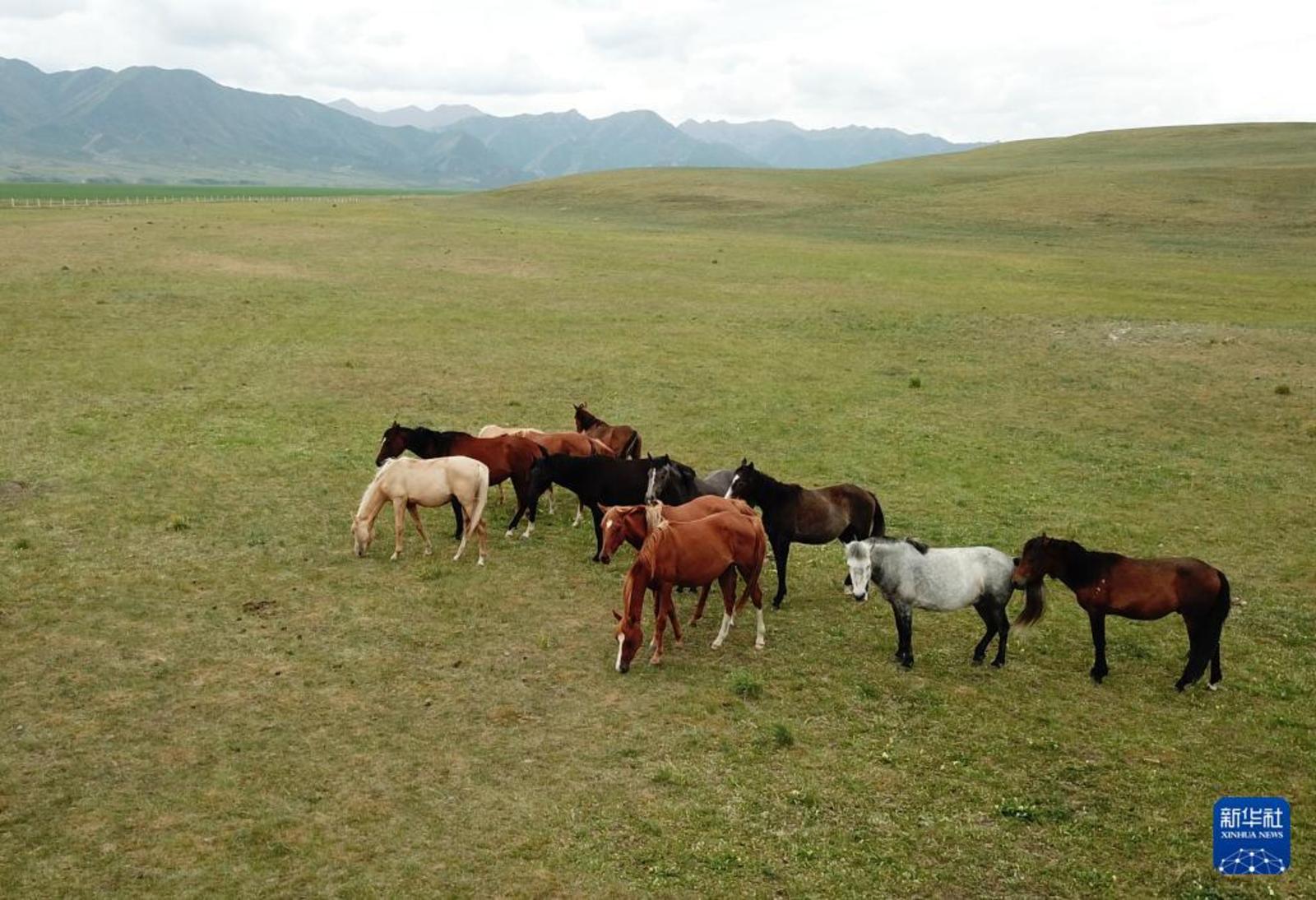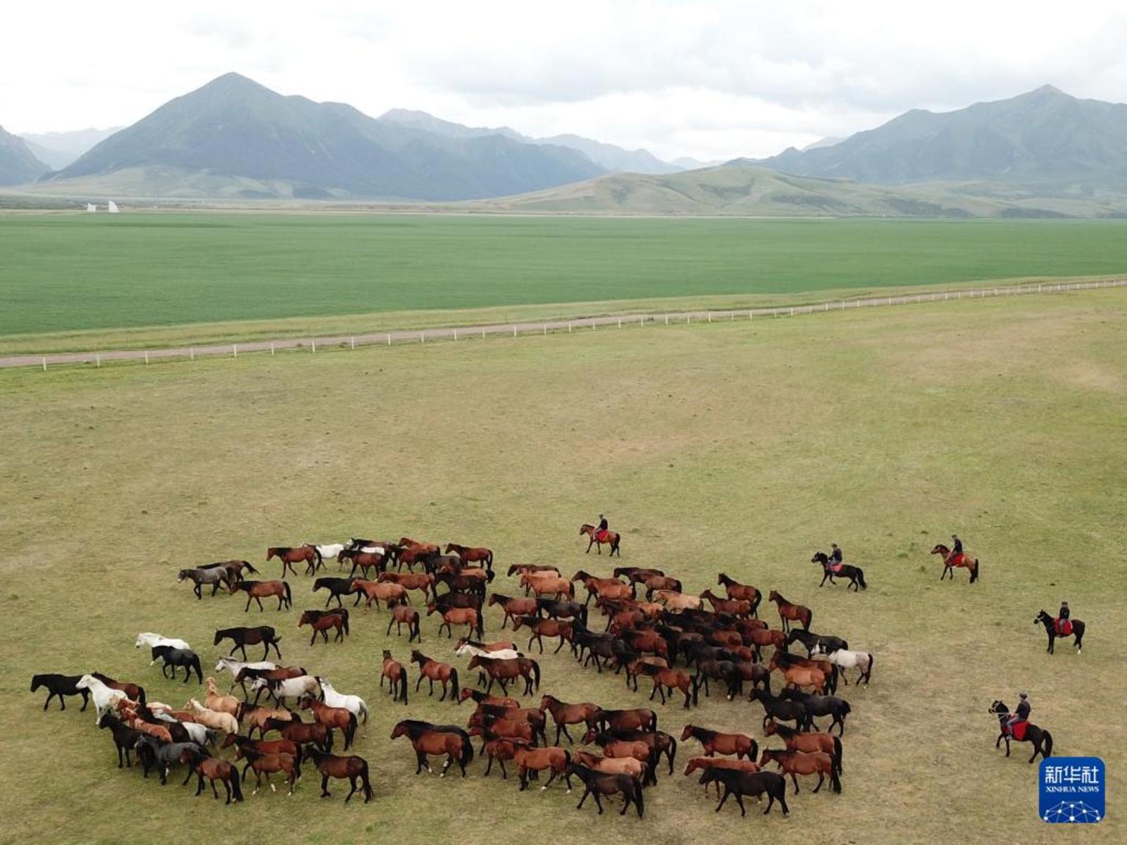 这是8月6日在山丹马场一场有限责任公司拍摄的马群(无人机照片)。新华社记者 马宁 摄