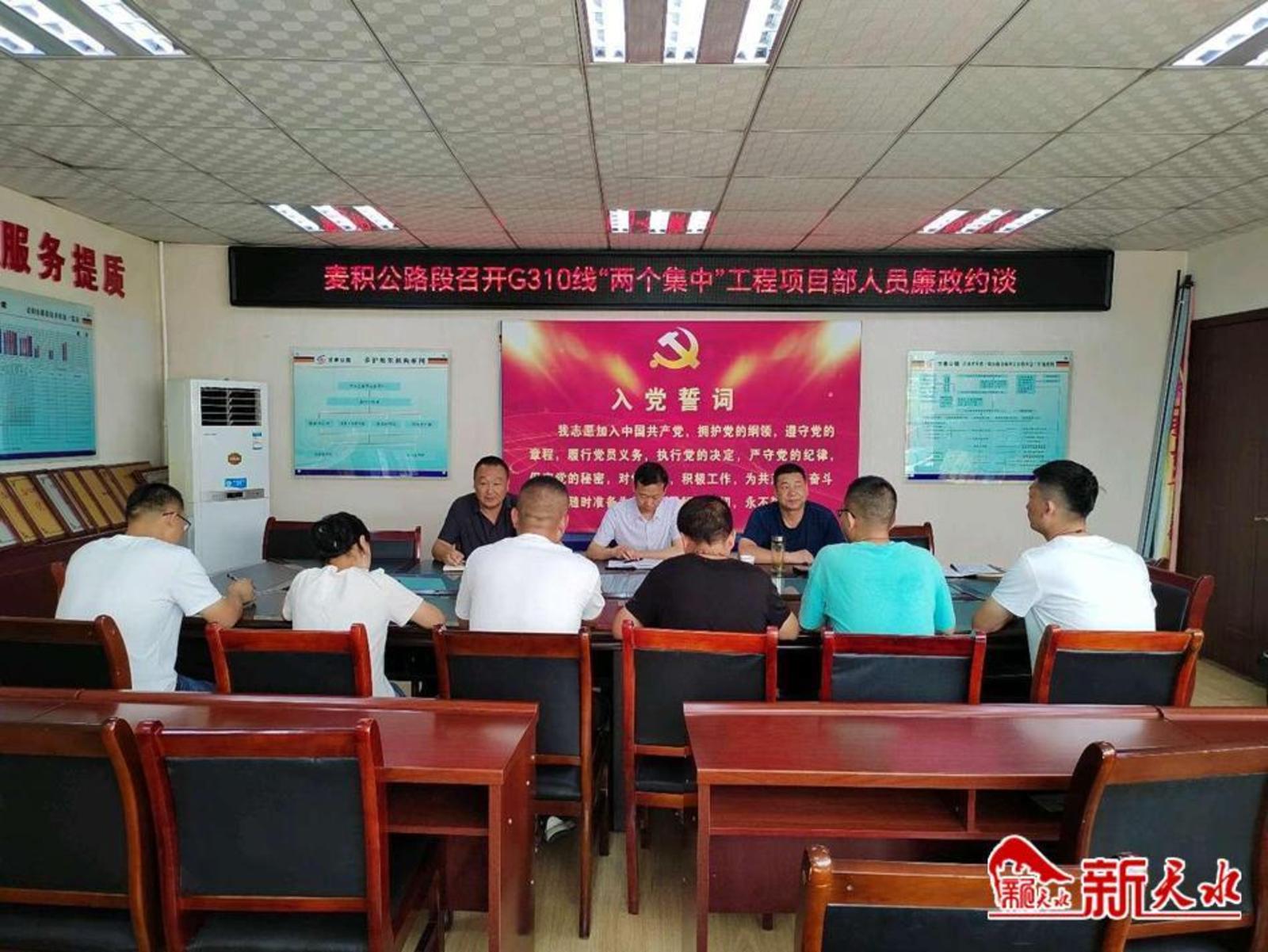 新天水讯 8月7日,为保证G310线牛北公路4号、5号棚洞“两个集中”工程顺利实施,麦积公路段召开了G310线“两个集中”工程项目部人员廉政谈话会议,以提高项目部全体人员廉洁从业意识,规避违法违纪行为的发生。