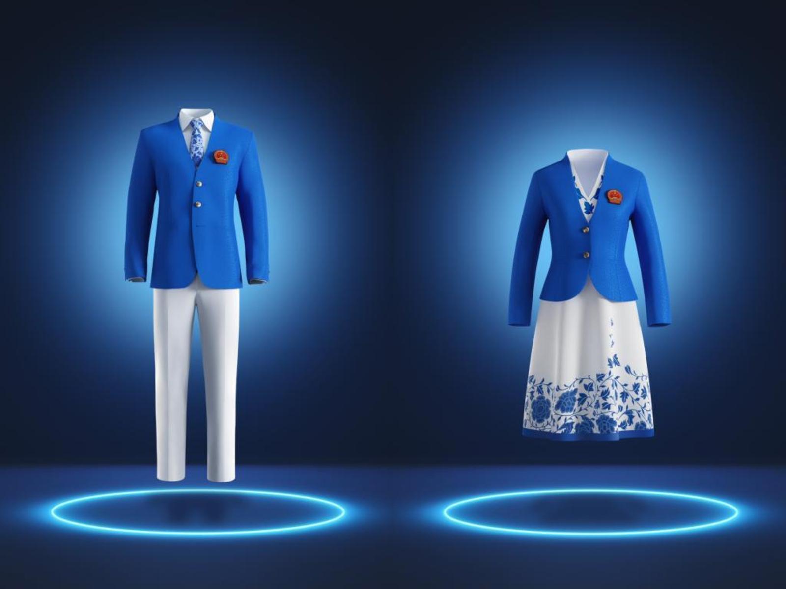 该礼服由九牧王打造,主色调为白与蓝;锁甲纹环环相扣,暗示体育的竞技属性以及团结、坚韧的特点;牡丹与藤蔓交织,寓意蓬勃的生命力;颈部半立领设计则彰显中国服饰文化的魅力。