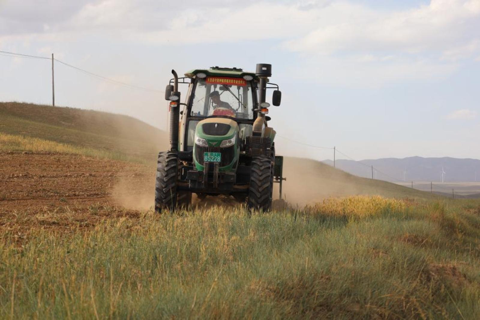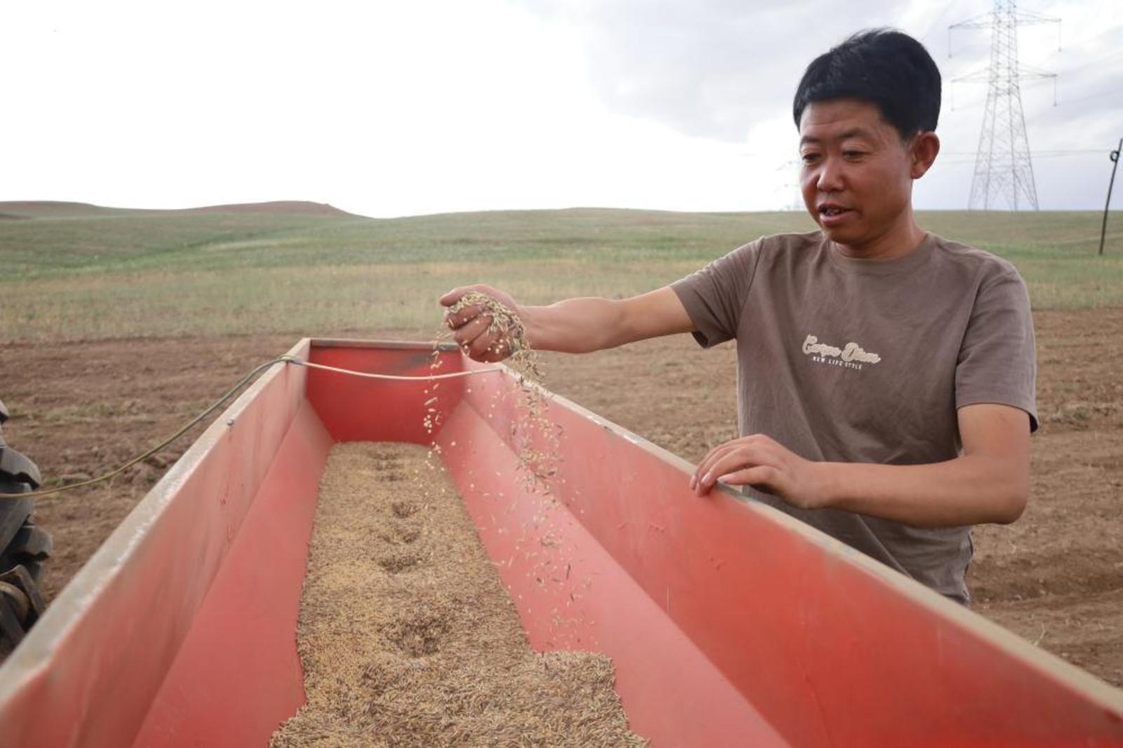 8月21日,在兰州市永登县坪城乡歇地沟村,当地合作社、村民补种燕麦、荞麦等小杂粮。新华社记者马希平摄