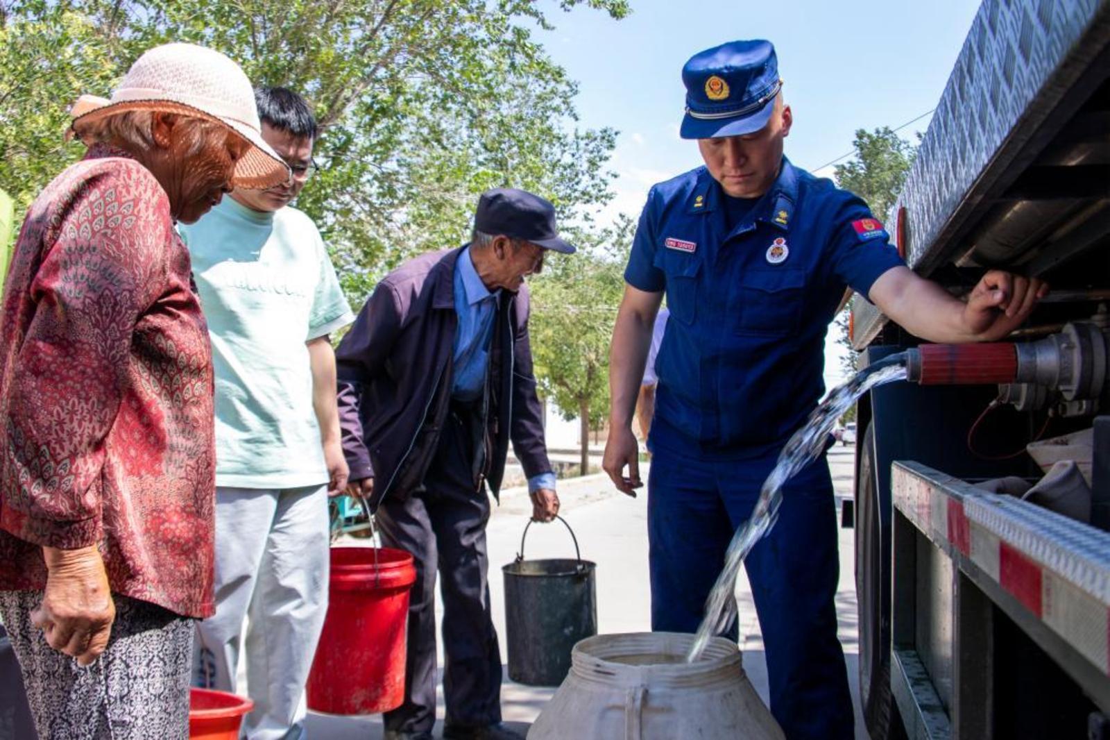 8月15日,张掖市森林消防支队为山丹县干旱缺水地区群众送水。(张掖市森林消防支队供图)