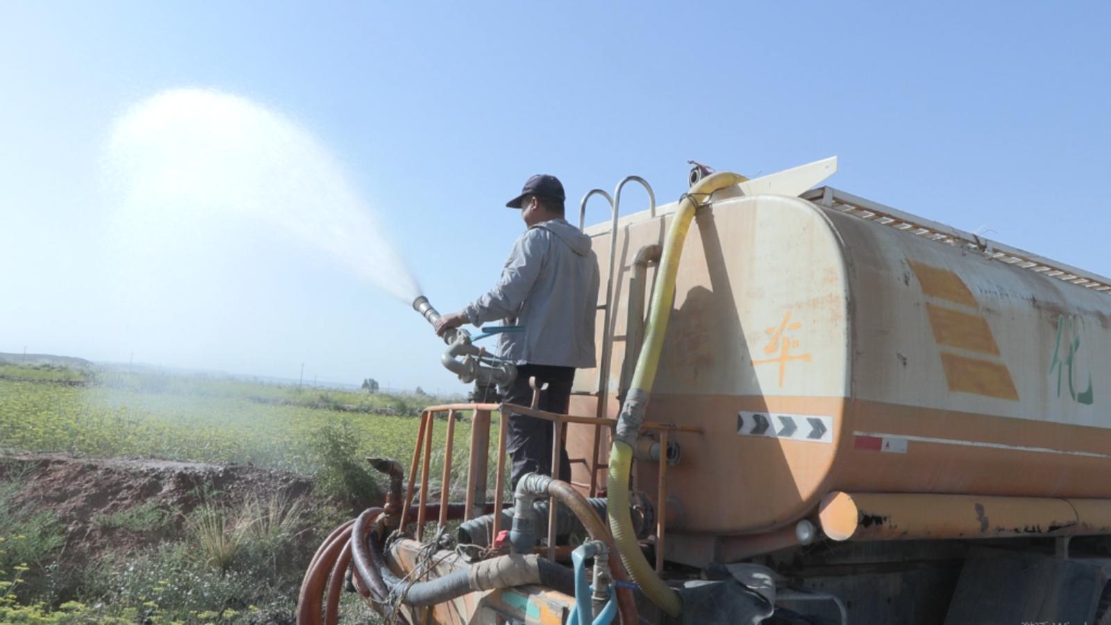 8月16日,甘肃省张掖市山丹县位奇镇汪庄村茴香地因干旱缺水,农户用洒水车进行灌溉。(山丹县委宣传部供图)