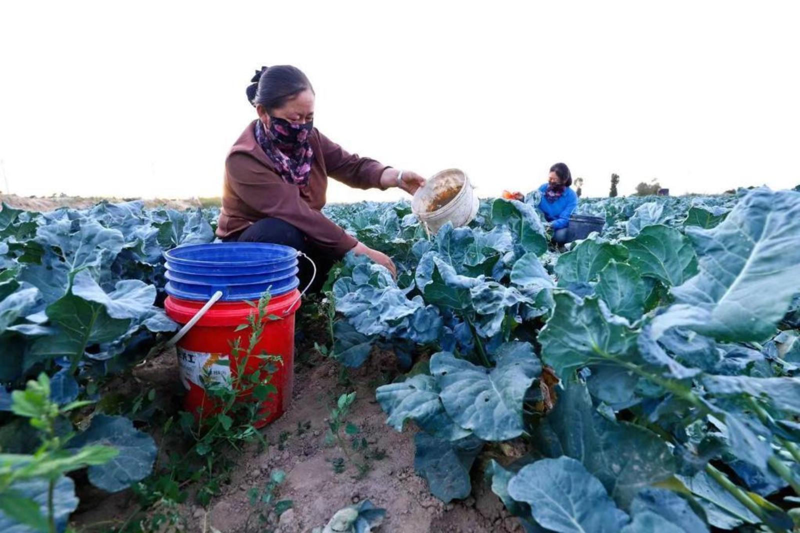 8月23日,甘肃省张掖市山丹县陈户镇高原夏菜种植农户进行手工浇水助苗成长。(山丹县委宣传部供图)
