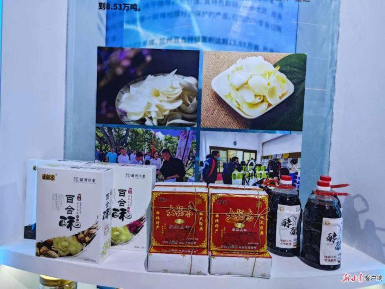 兰州百合的展柜前,工作人员正在忙碌着打包商品,百合醋、百合酥、百合核桃点心等颇受欢迎。