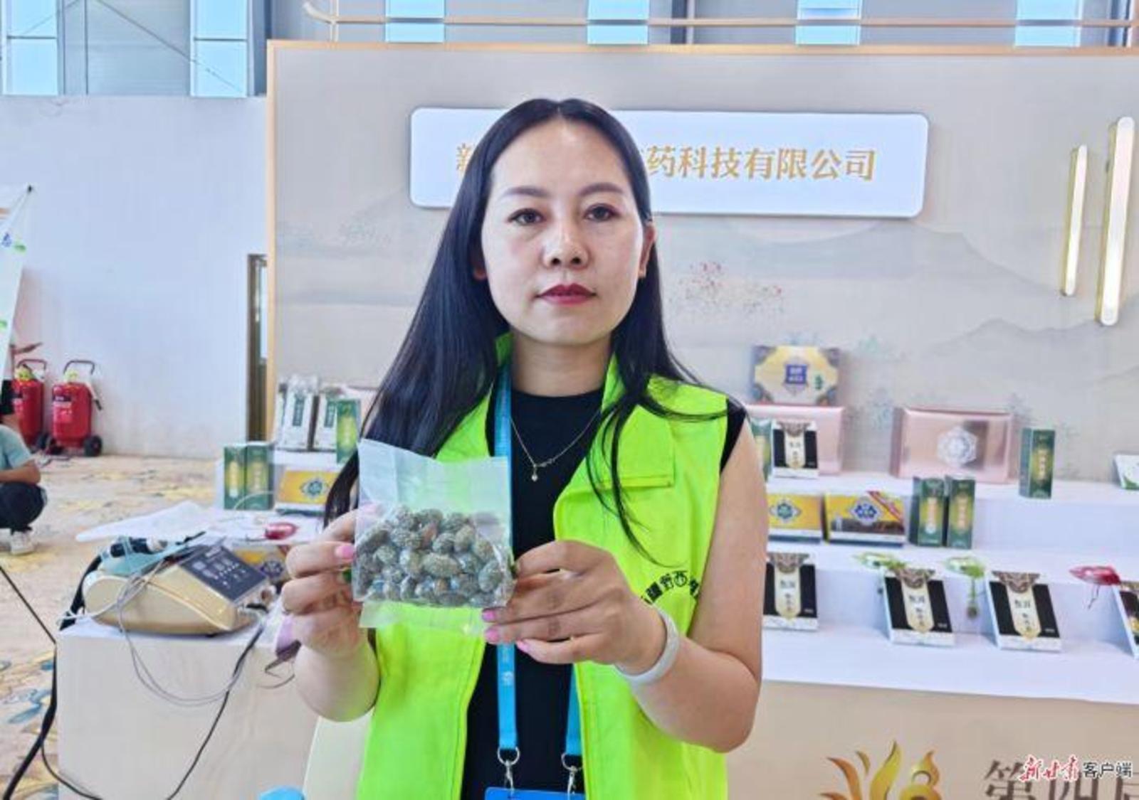 展销会上,来自天南海北的医药企业代表向大家积极展示着自己带来的产品。杨彩兰是新疆野西瓜维药科技有限公司的合伙人,她介绍道:“新疆野西瓜是大漠里的珍宝,它又名刺山柑,被称为‘西域奇果’,它与普通西瓜不一样,是不能直接食用的。”