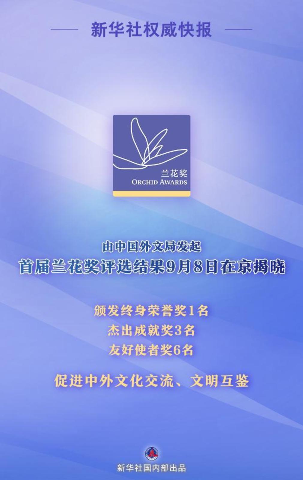 首届兰花奖颁奖典礼9月8日在京举行,颁发终身荣誉奖1名,杰出成就奖3名,友好使者奖6名。
