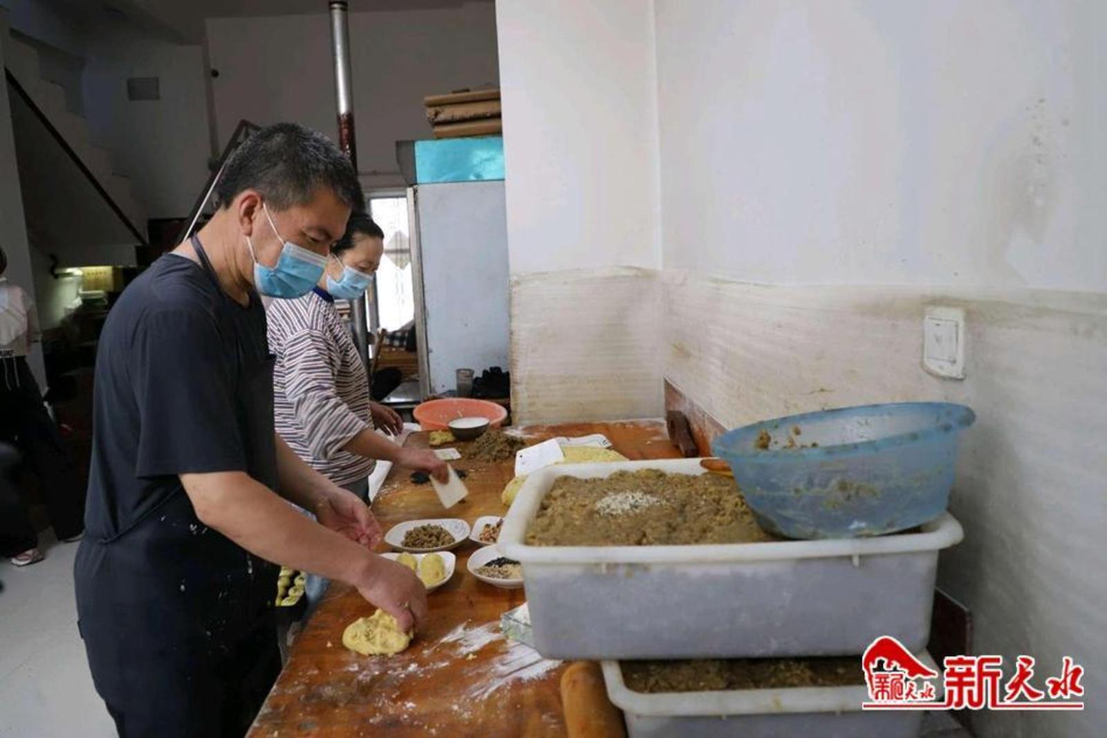 店里,老板和妻子正在加紧做月饼、点心等各种糕点。和面、揉面、醒面、配馅、扯皮、包馅、按压成型、烘烤,每一个步骤都是纯手工制作。老板介绍,每一道工序都有严格的制作要求,醒面时间、水油面、包馅等都有严格的规定。一丝一毫,尽显传承与发扬。
