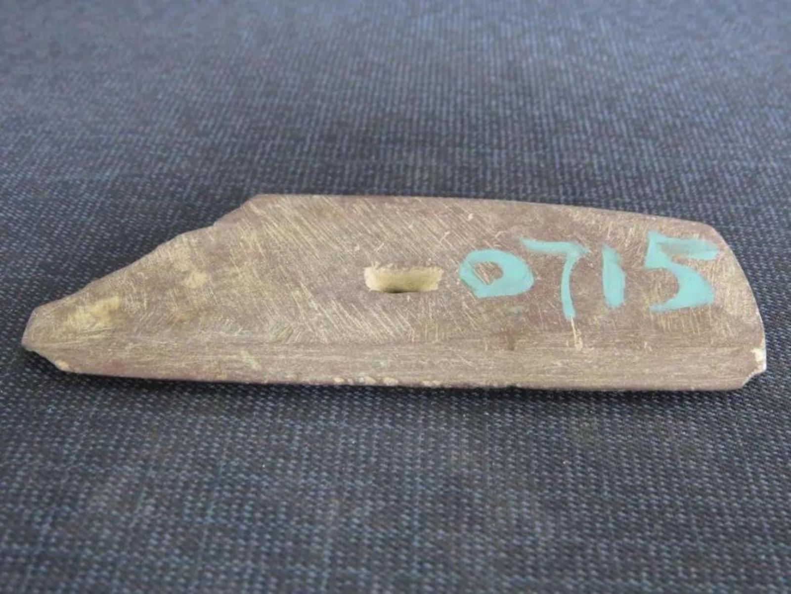 张家台子遗址出土马家窑文化带孔石刀。长11.1厘米,宽4.6厘米,厚0.6厘米,重75克。石质,长方片状,表面磨光,直刃直背,中间钻一小孔,薄厚不均匀,边缘薄于中部,一角残缺。