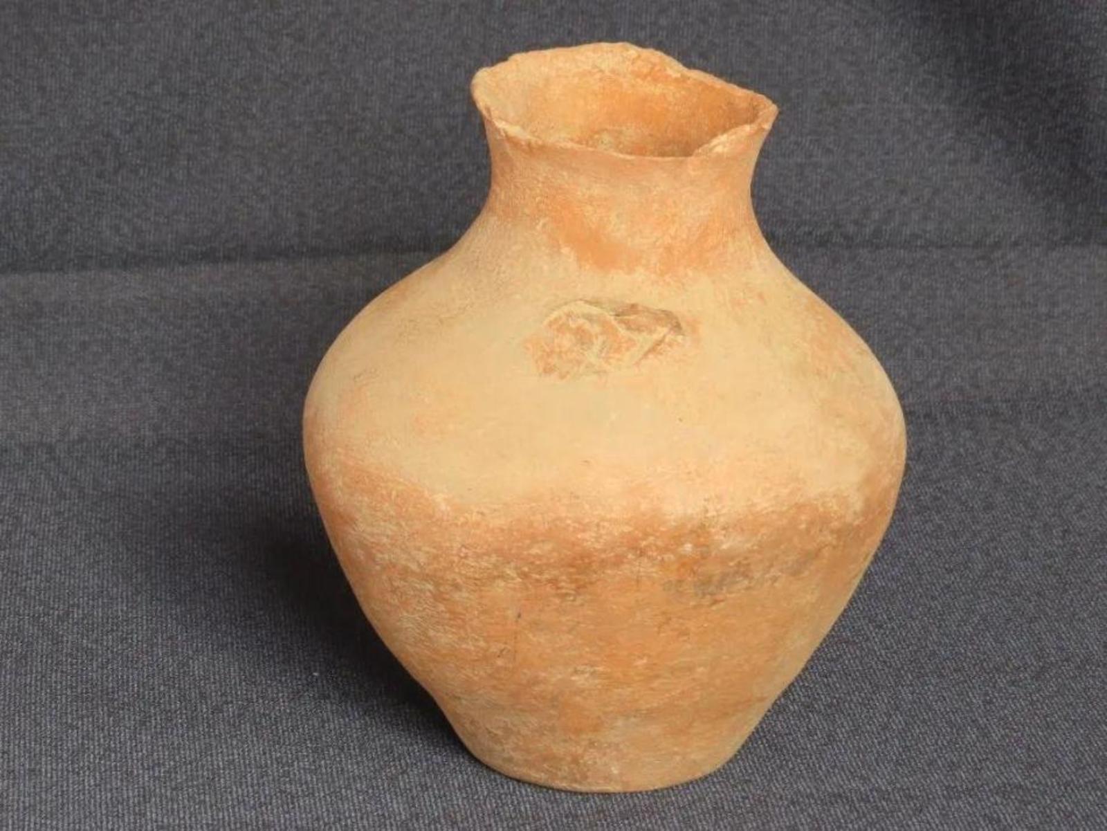 张家台子遗址出土齐家文化泥质红陶罐。口径8.5厘米,底径8厘米,腹径17.2厘米,通高20厘米,重885克。泥质红陶,侈口,束颈,溜肩,鼓腹,小平底。素面,器表光滑,口沿残。