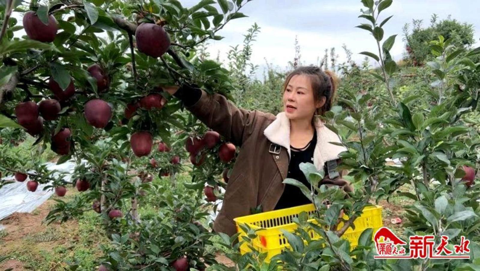 装苹果的集装箱倒扣过来,成了直播带货的小桌板,“小白菜”蹲在地上,手里拿着一个果形饱满、红得透亮的花牛苹果,面对镜头大方真诚地讲解着。屋外细密的小雨绵柔柔地下,“小白菜”的鞋底还沾着刚从苹果地里带回来的湿润润的泥土,身边是家人正在娴熟地将从树上刚摘下的果子套袋、装箱。